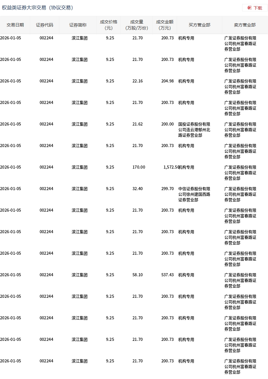 滨江集团今日大宗交易折价成交542.98万股,成交额5022.64万元