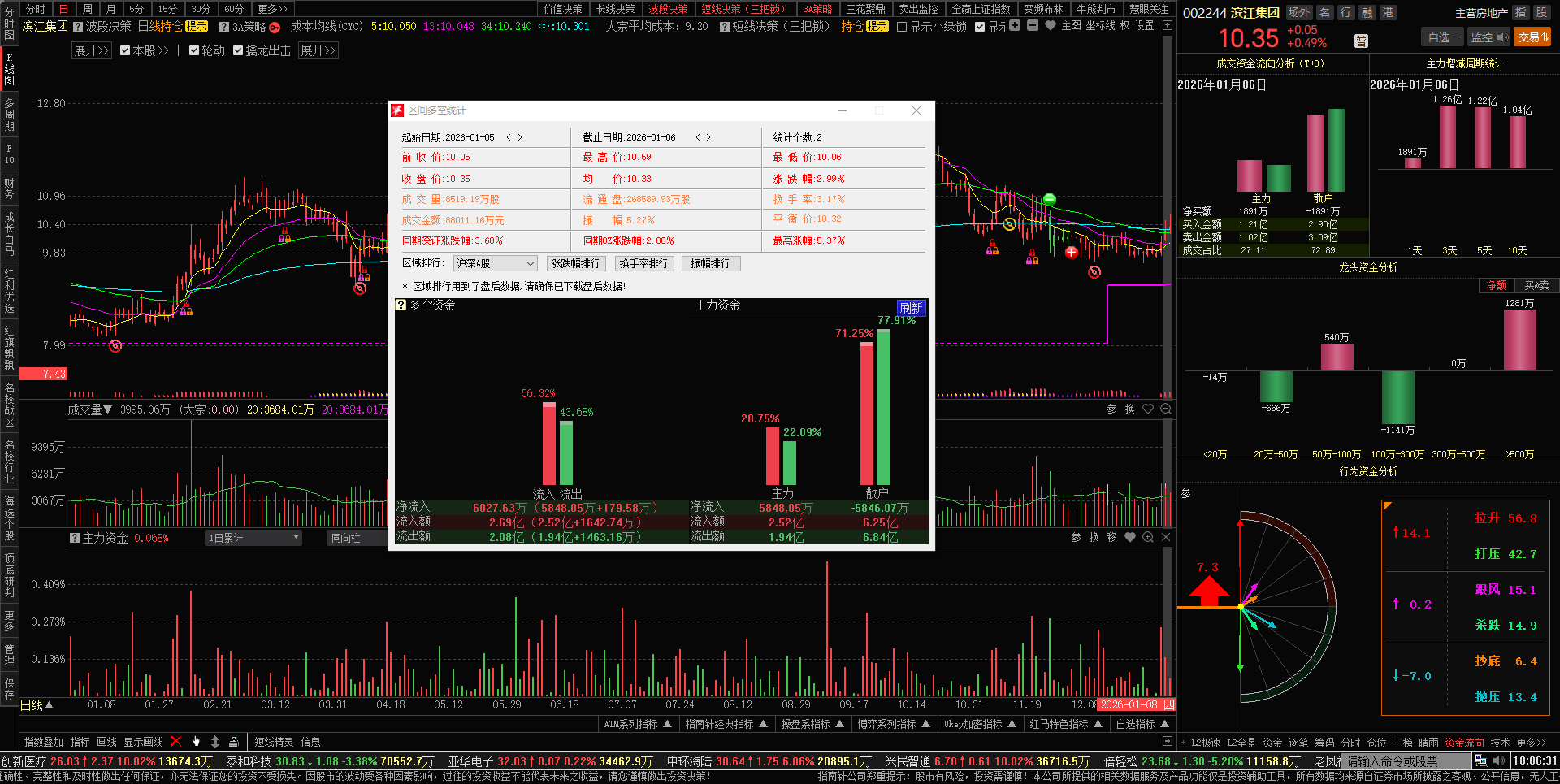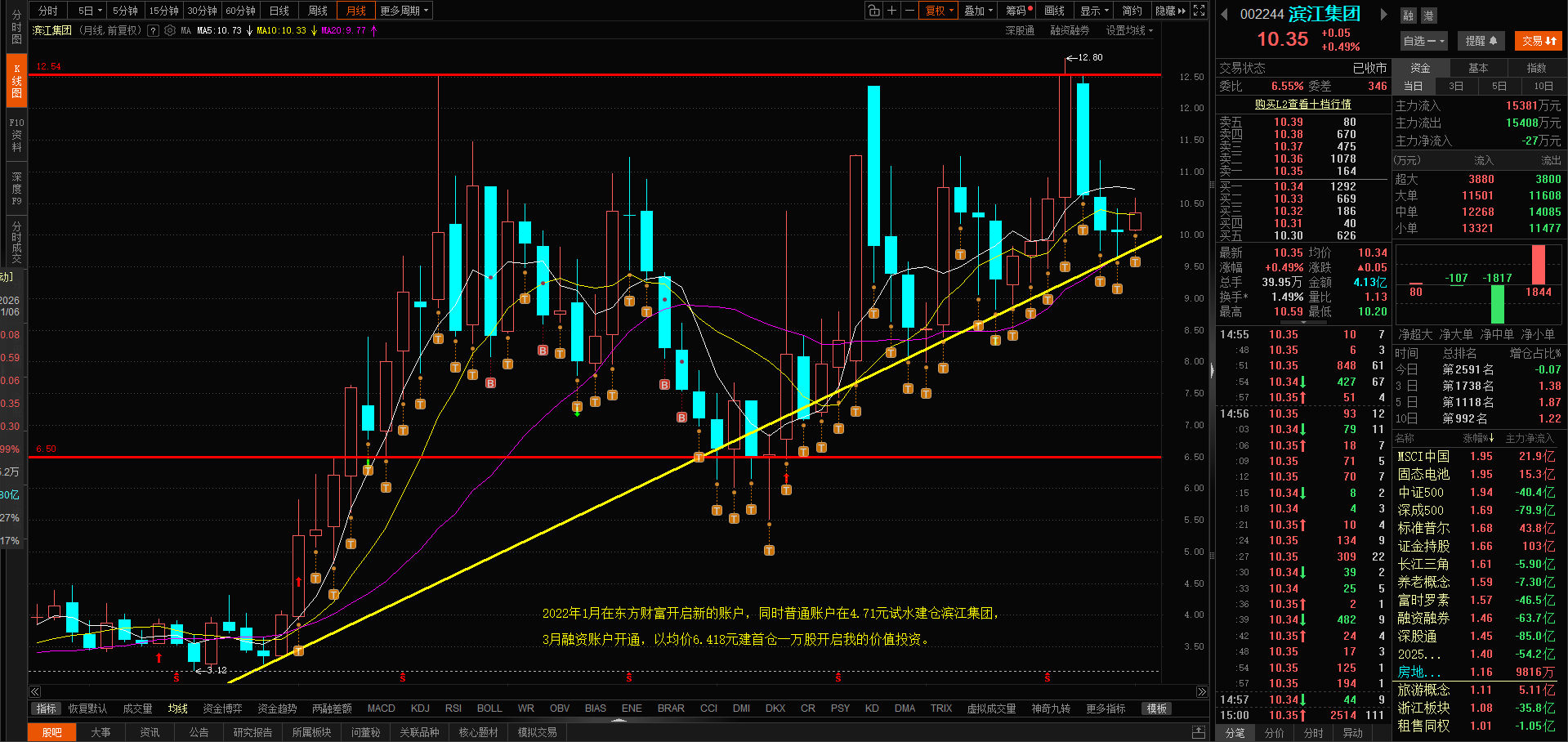 今日滨江换手率1.49%,涨幅0.49%,收盘价10.35元,今日主力资金净流入1891万元。支撑位10.17元,阻力位12.09元。大股东减持期间不会大涨大跌,继续锁仓做T,摊低持仓成本,保持好心态。今日买卖:低吸高抛,买入均价10.311元,卖出均价10.409元,最高卖出价10.52元,最低买入价10.21元。