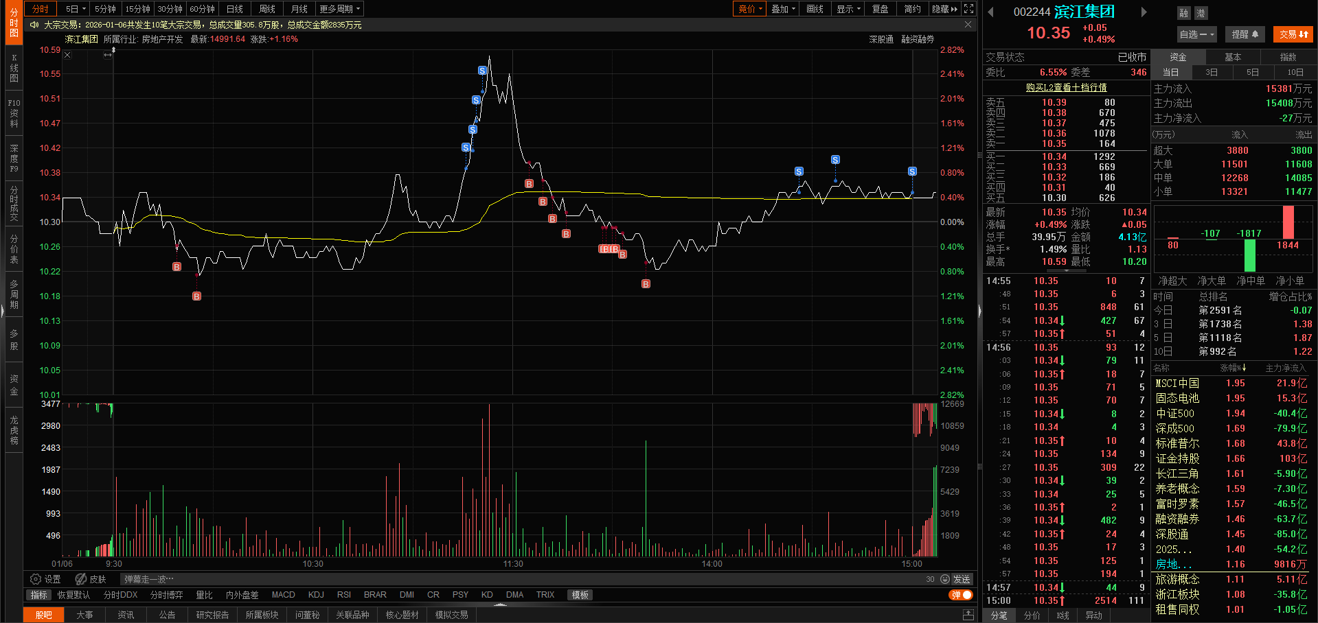 今日滨江换手率1.49%,涨幅0.49%,收盘价10.35元,今日主力资金净流入