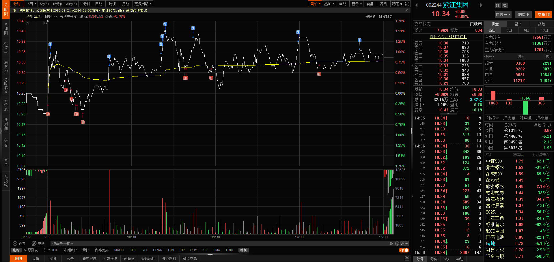 今日滨江换手率1.20%,涨幅0.88%,收盘价10.34元,今日多空资金净流入