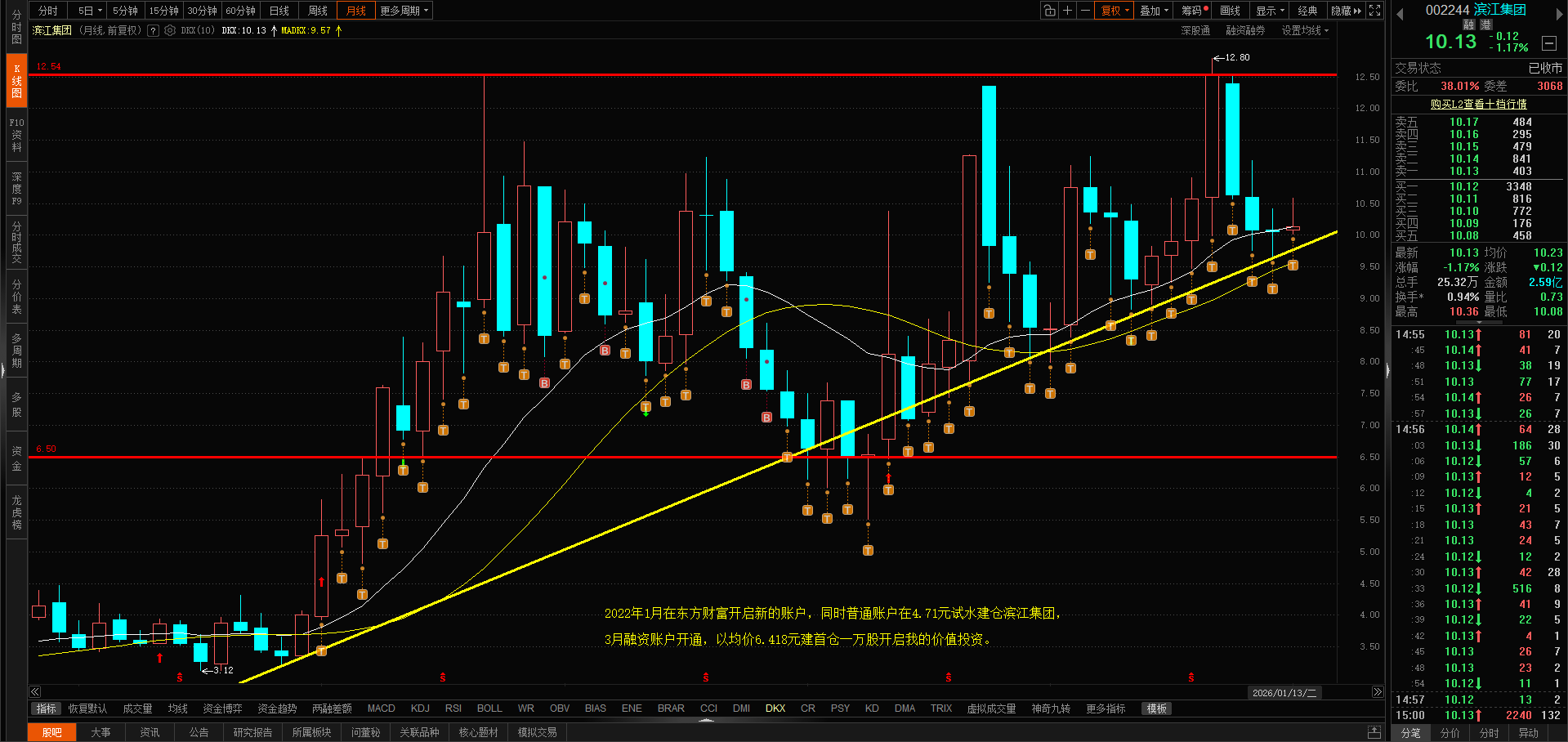 今日滨江午后随大盘下跌调整,跌幅1.17%,换手率0.94%,收10.13元,仍