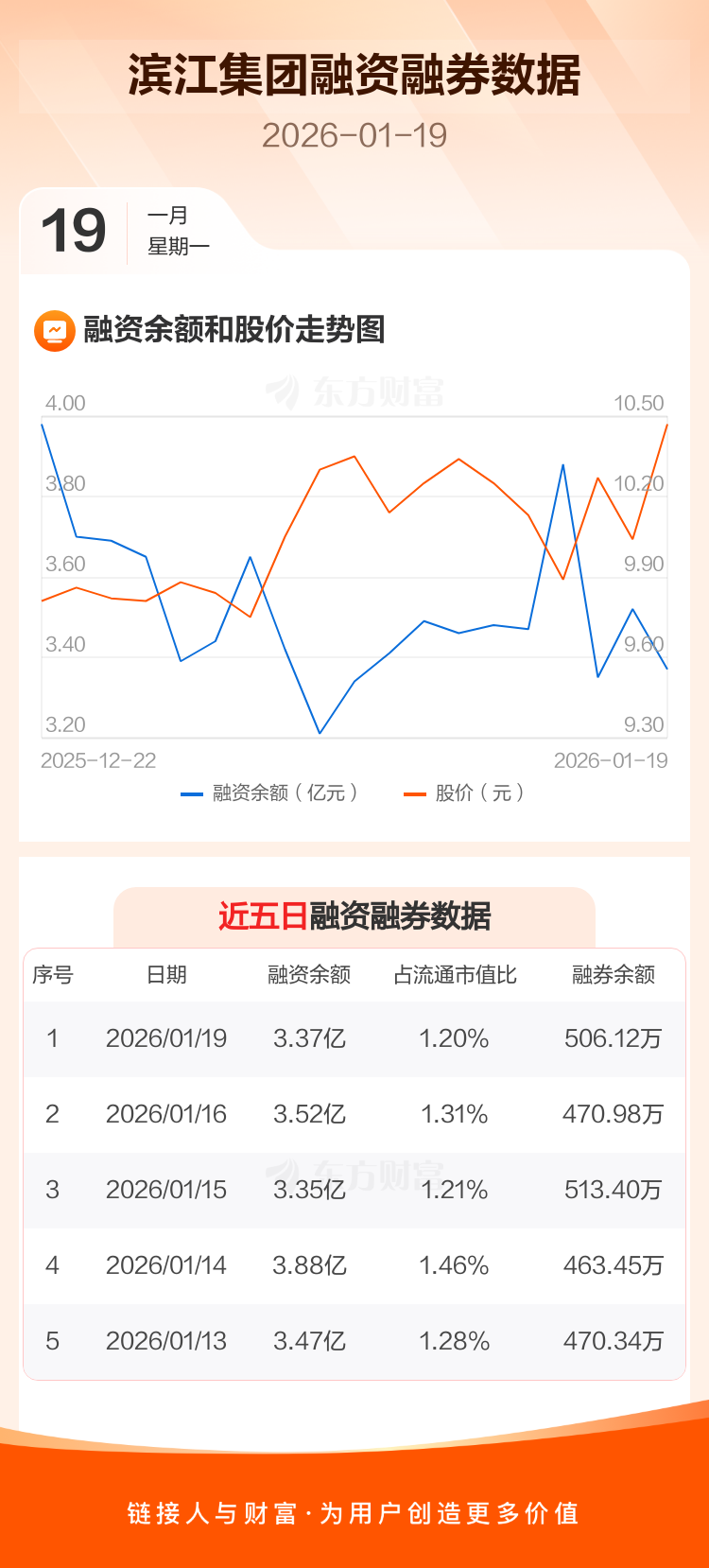 交易所最新数据显示,滨江集团于2026年1月19日获融资买入6662.65万元,融资偿还8131.00万元,当日融资净偿还1468.35万元。目前,该股融资余额3.37亿,占流通市值比例为1.20%。