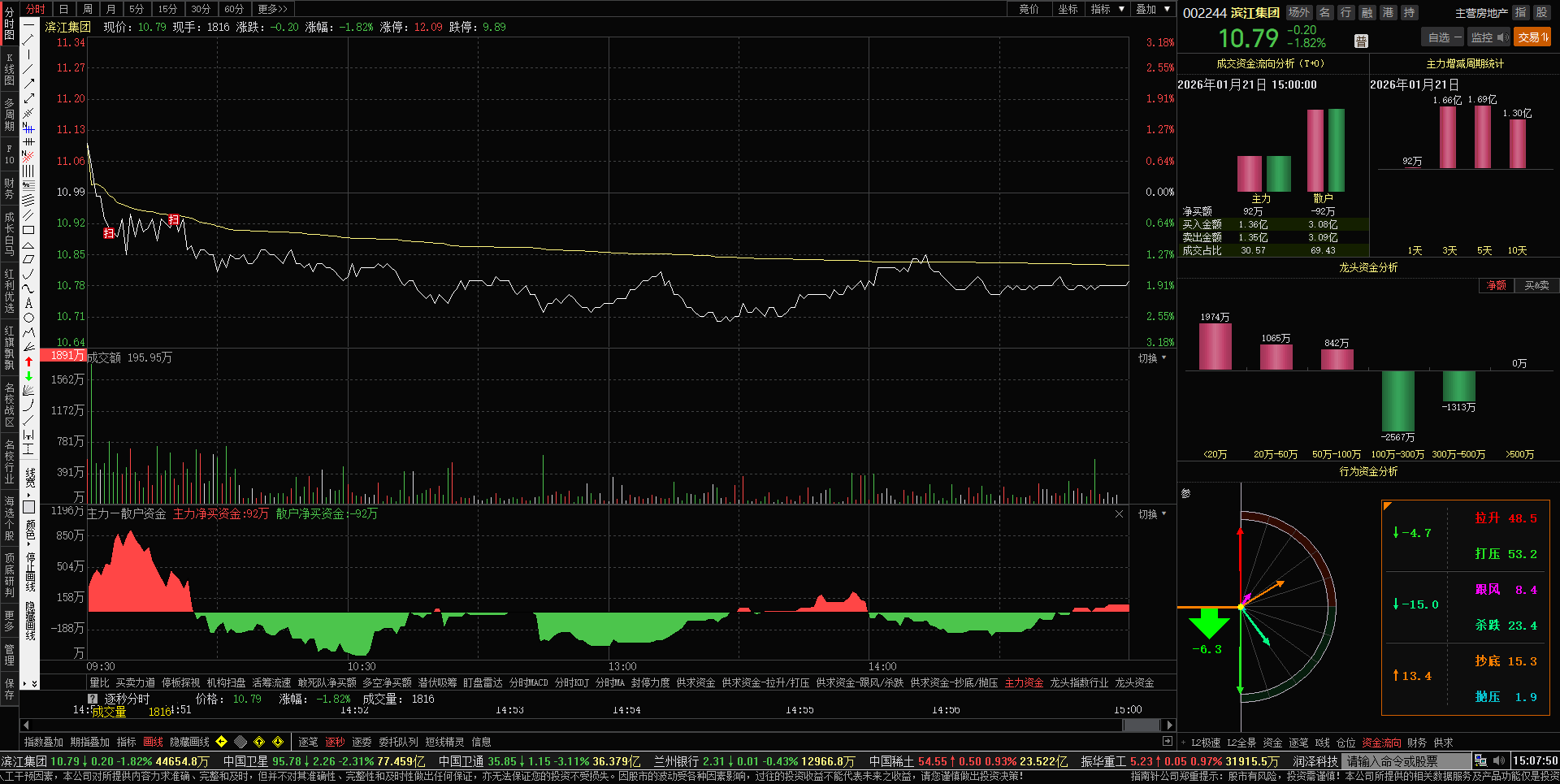 今日滨江缩量回车整理,收盘价10.79元,主力资金净流入92万元,明天有望重拾升