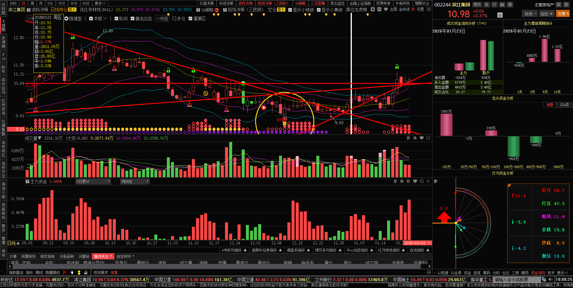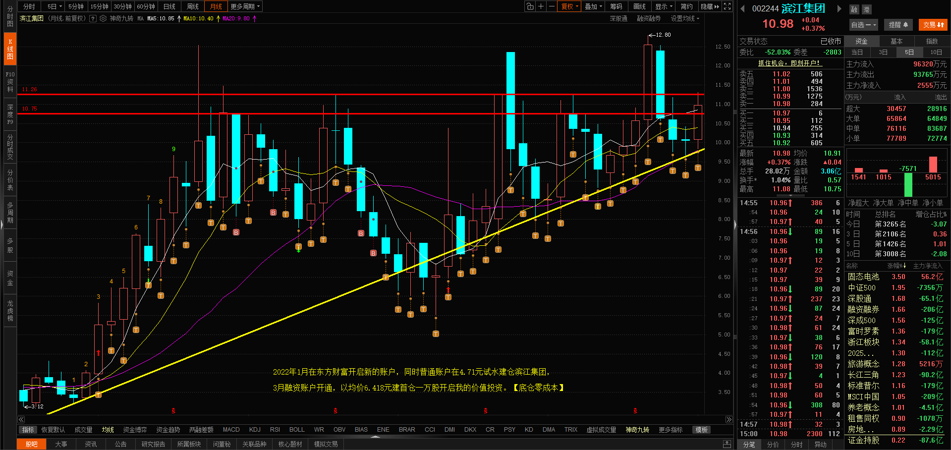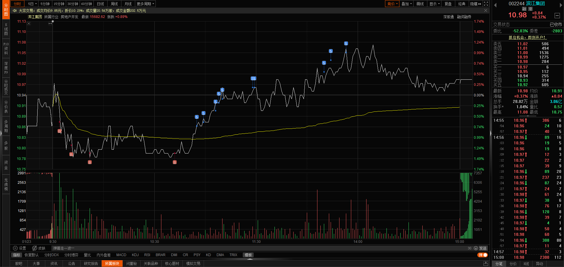 今日滨江继续缩量洗盘微涨,换手率1.04%,涨幅0.37%,收盘价10.98元,