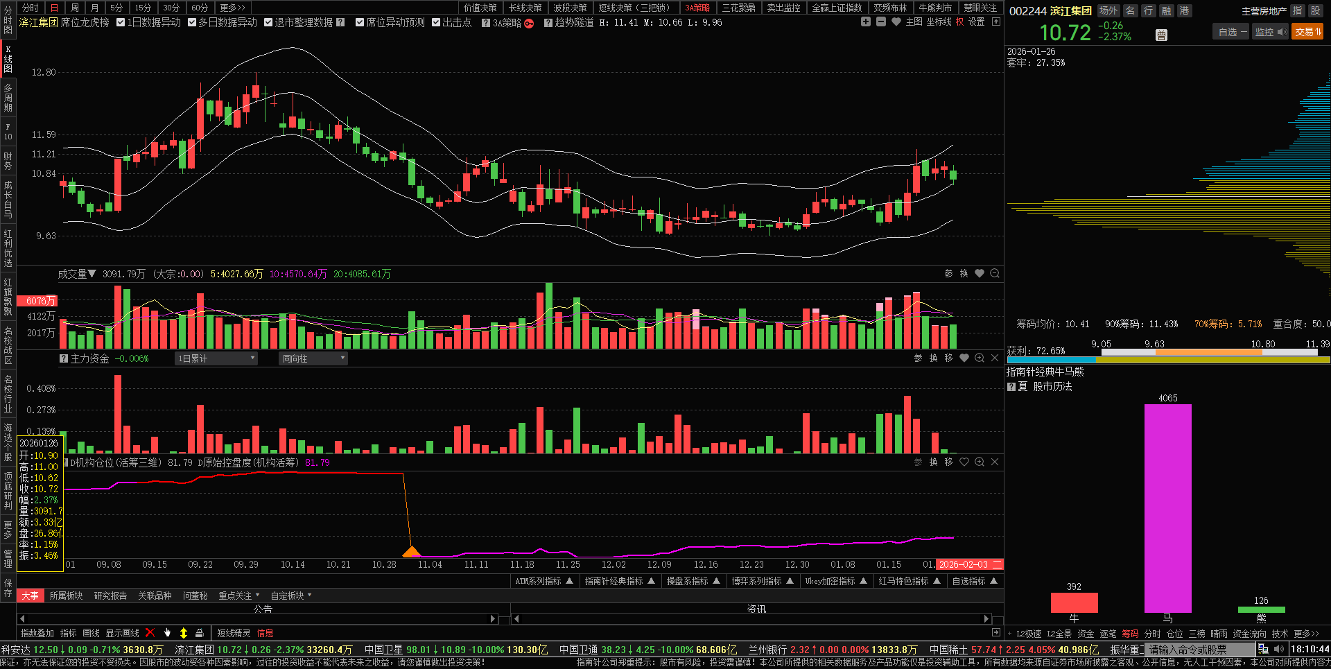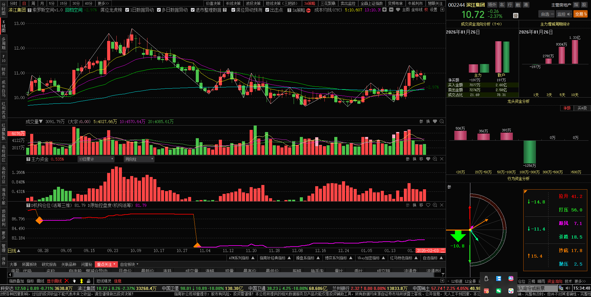 今日滨江主力洗盘,继续锁仓,明日有望探底回升。今日主力资金净流出仅仅179万元,保持好心态。今日低位短线已加仓。