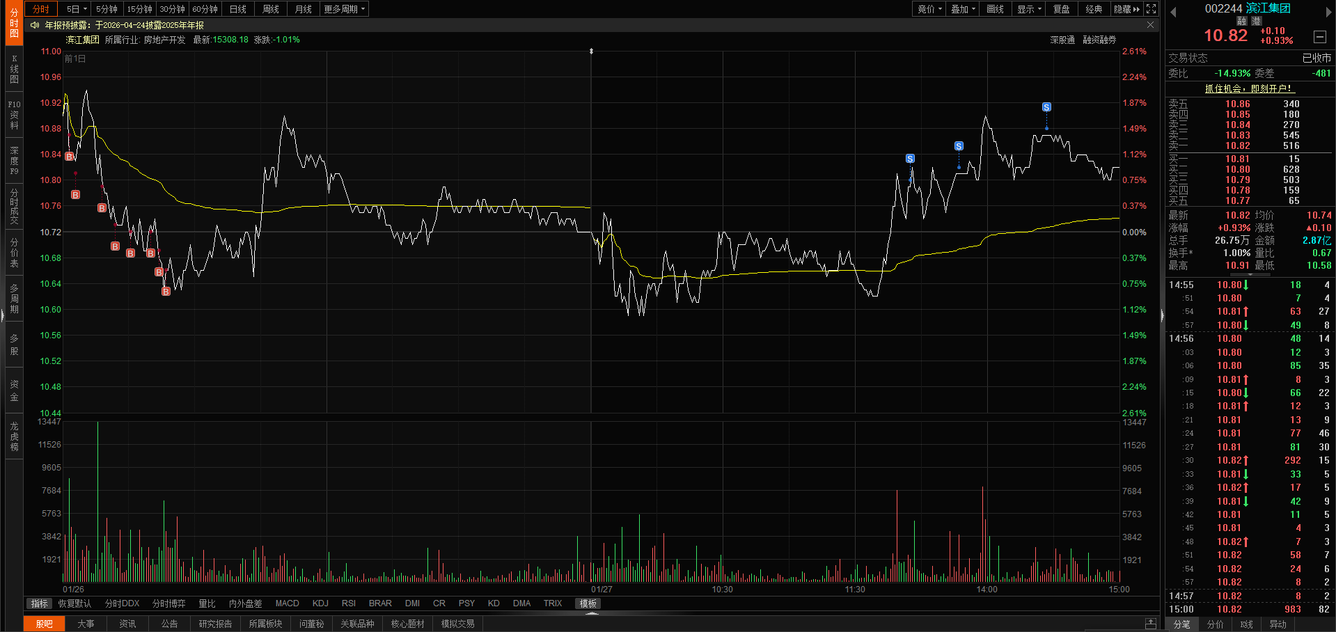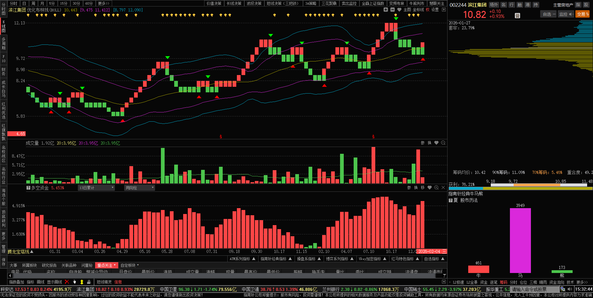 今日滨江缩量洗盘,换手率1.00%,涨幅0.93%,收盘价10.82元,今日主力
