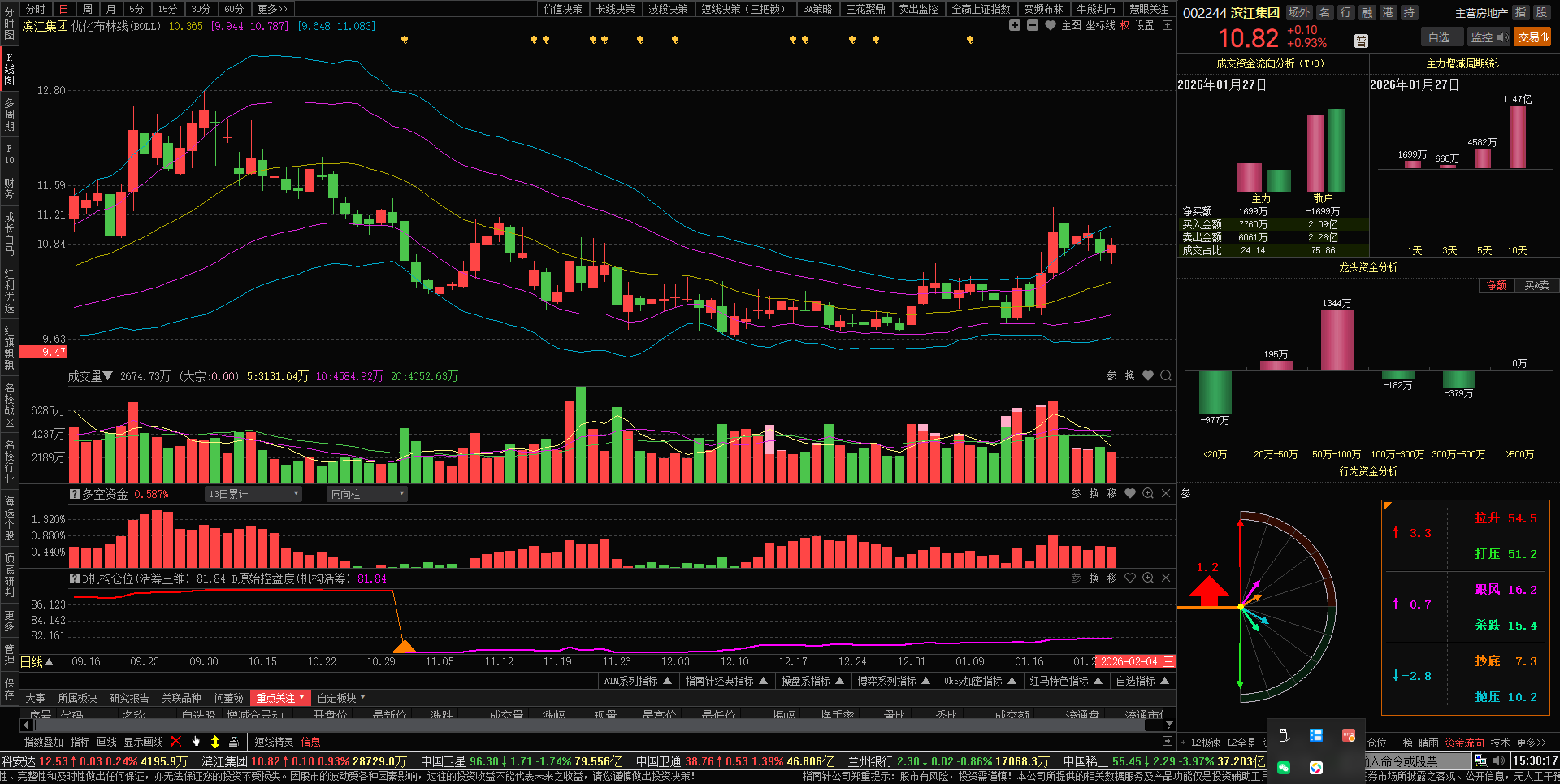 今日滨江缩量洗盘,换手率1.00%,涨幅0.93%,收盘价10.82元,今日主力资金净流入1698.86万元,继续锁仓做T,摊低持仓成本,保持好心态。短线支撑位10.35元,阻力位12.29元。
