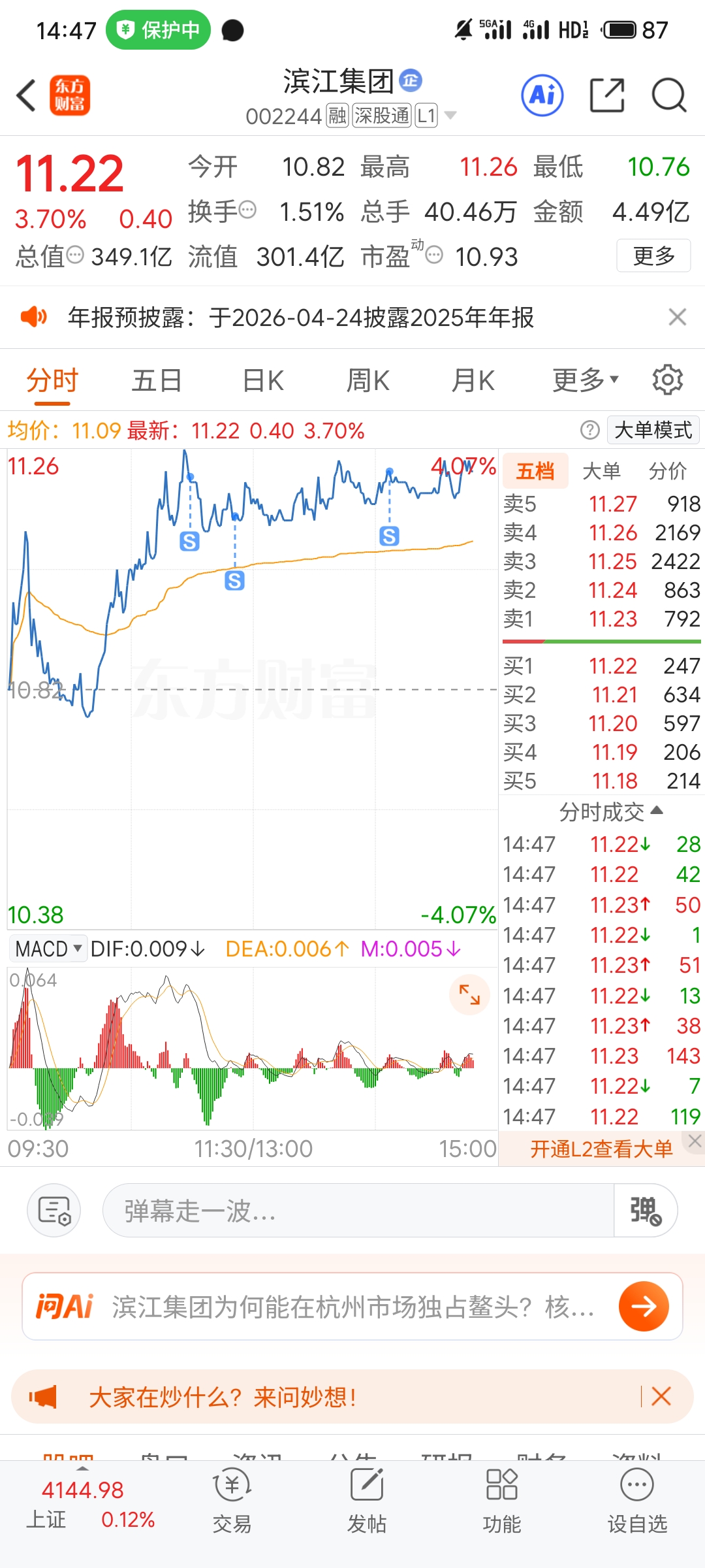 上午一直忙着年底的工作会议安排,没有时间打进提前量,把昨天水下买进来的以平均4个点左右分3笔T出去,谢谢今天滨江的表现,继续耐心持有,控制比例高抛低吸,心怀感恩,我心澎湃