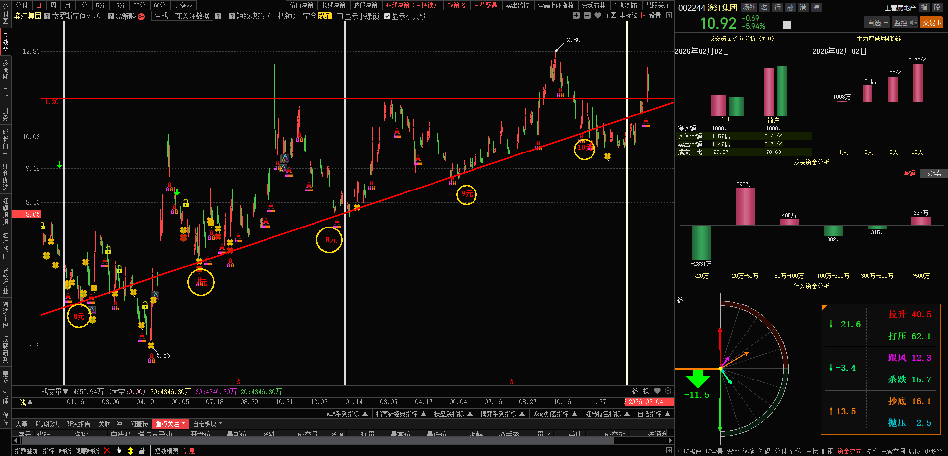 今日滨江主力机构随大盘调整暴力洗筹,并逆势增持1008万元,在月上升趋势中轨线1