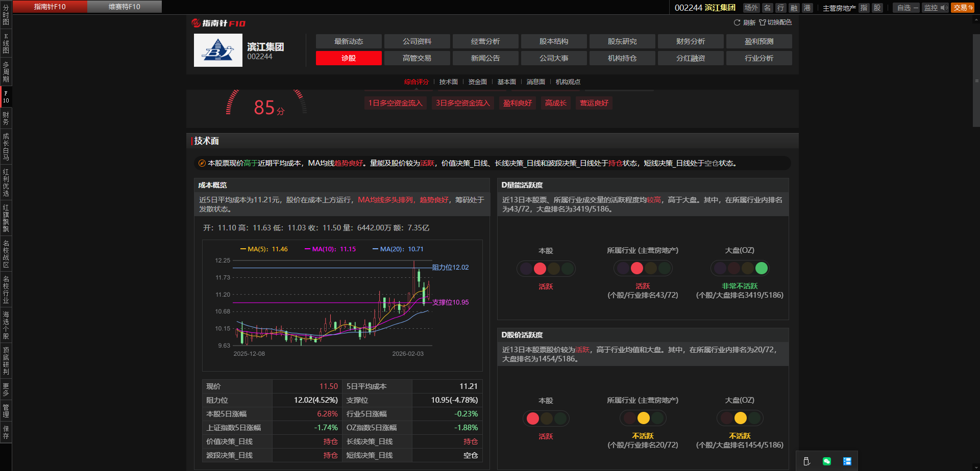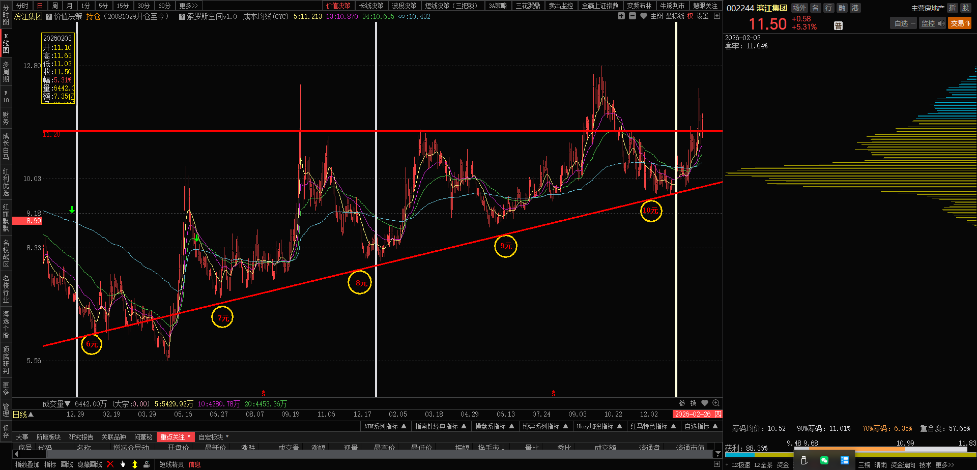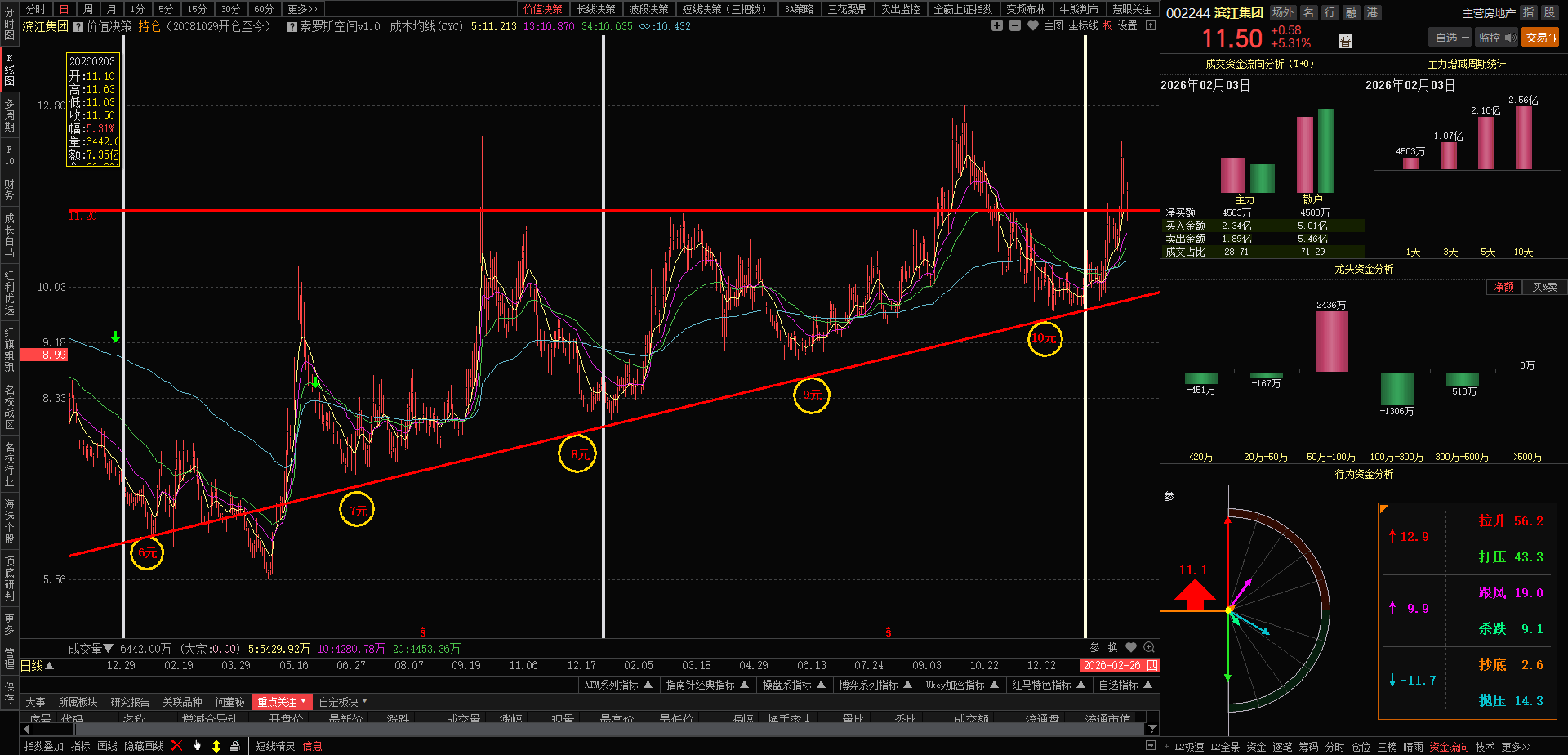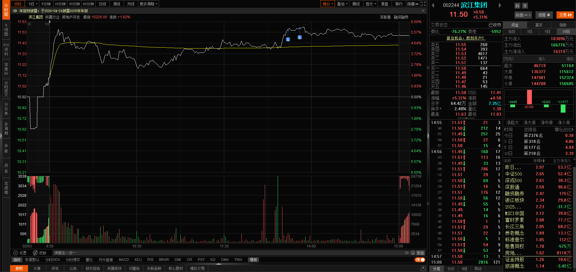 今日滨江高开高走,量能稍有放大,换手率2.4%,涨幅5.31%,收盘价11.50