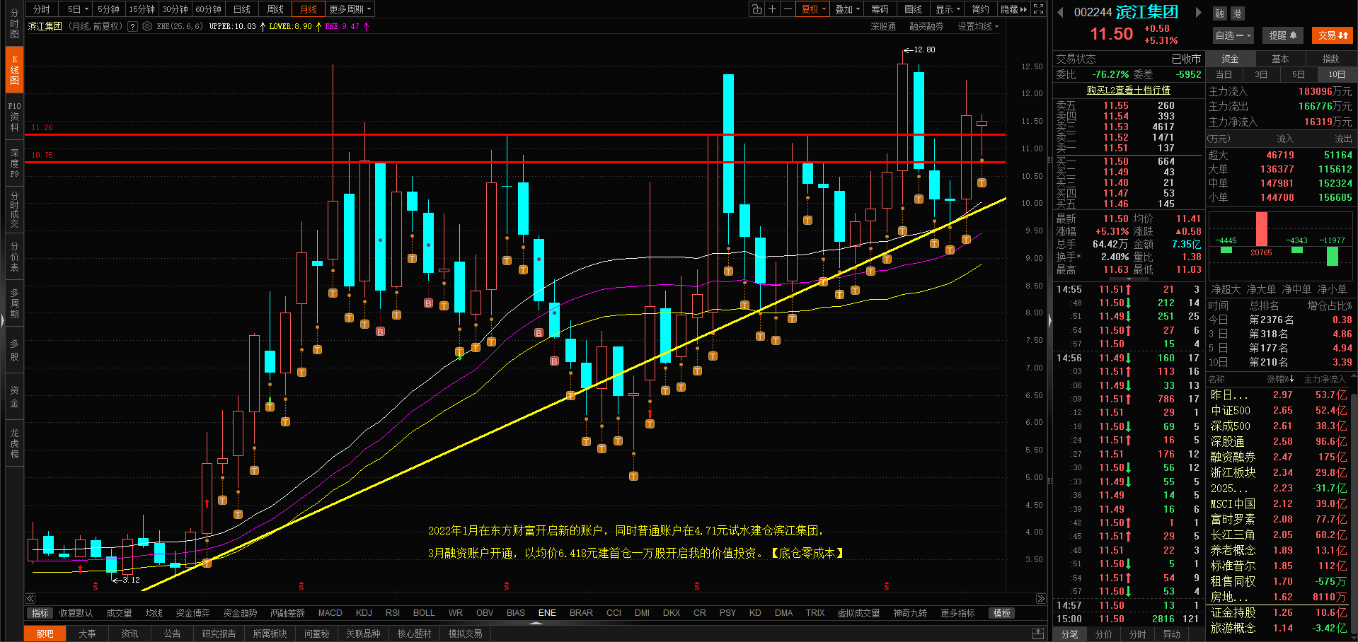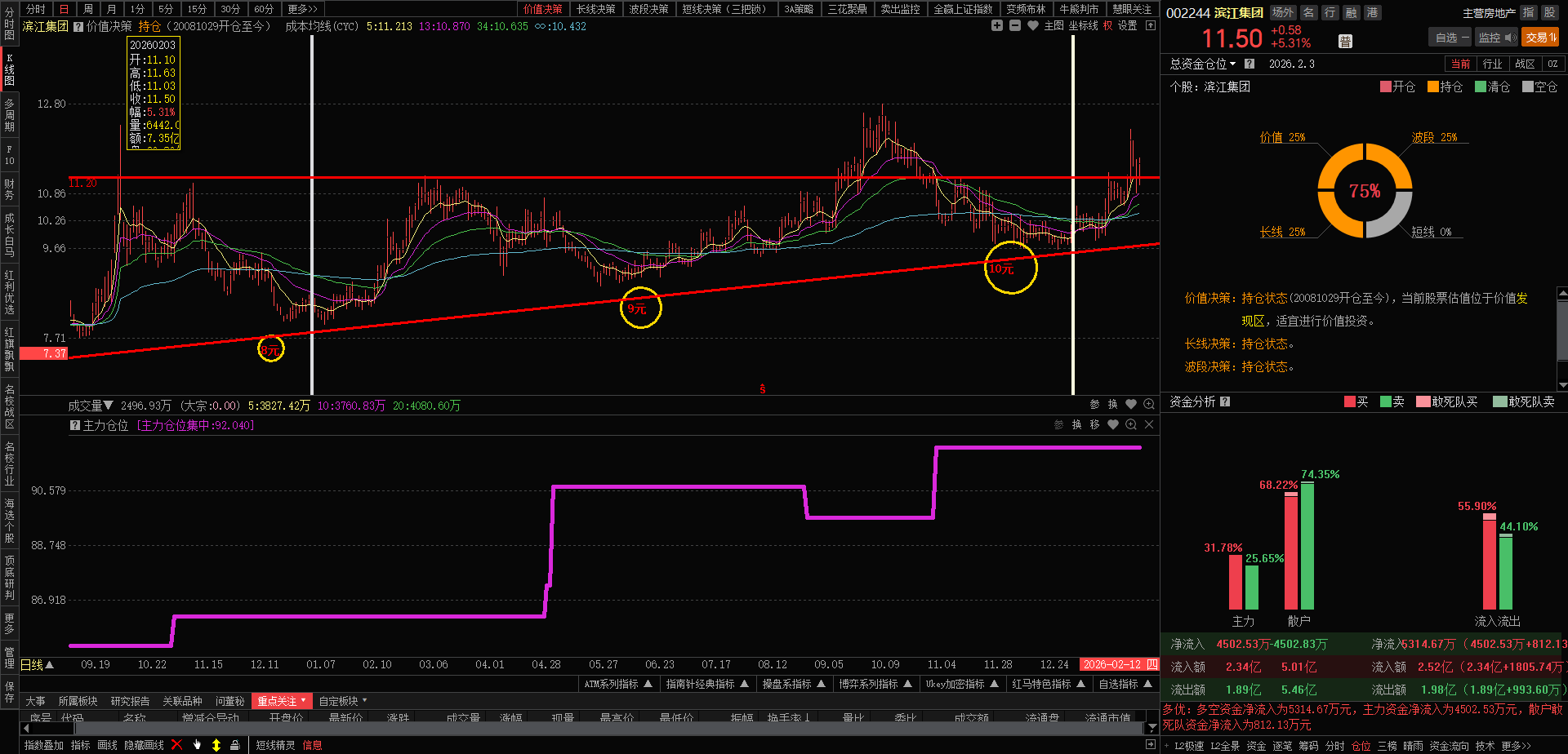 今日滨江高开高走,量能稍有放大,换手率2.4%,涨幅5.31%,收盘价11.50元,今日多空资金净流入5314.67万元,主力仓位集中度92.04的滨江集团,依然我行我素,进二退一,走自己的独立行情,(卧倒-匍匐-站立-冲锋),优质滨江继续锁仓看高,短线盘中T,可摊低持仓成本,保持好的心态,明天支撑位10.95元,阻力位12.02元。