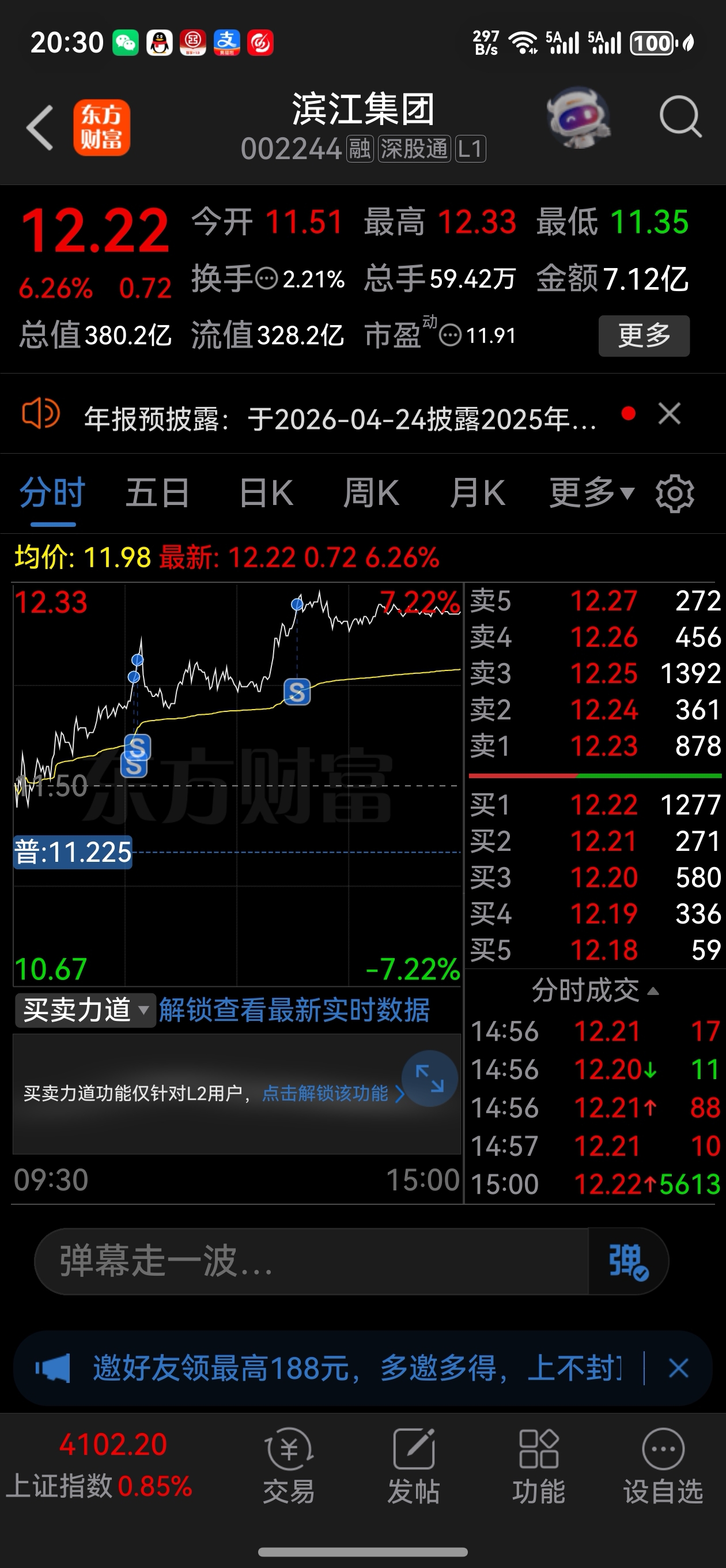 $滨江集团(SZ002244)$ 今日该滨江主力资金继续做多。今日短线均价12.08元减仓了部分,明后二天再逢高减仓短线补仓股。锁住底仓不动摇。优质滨江反弹目标价13-15元,反转目标价20元。保持好的心态。(外出休假一周中)