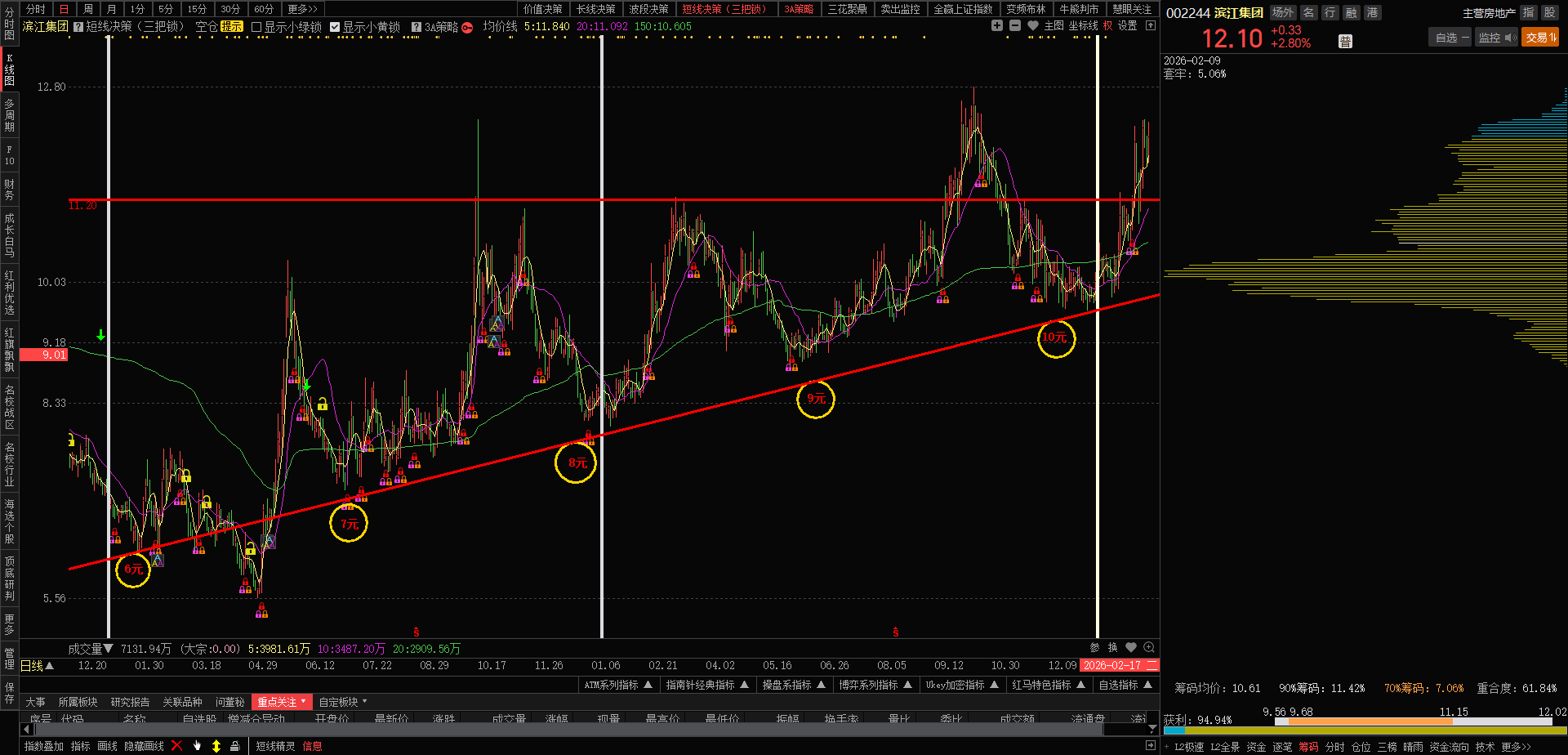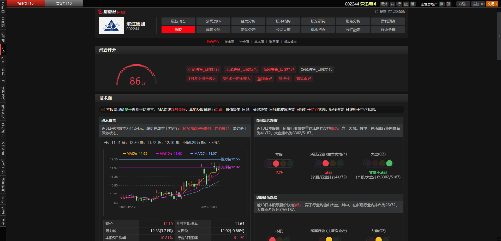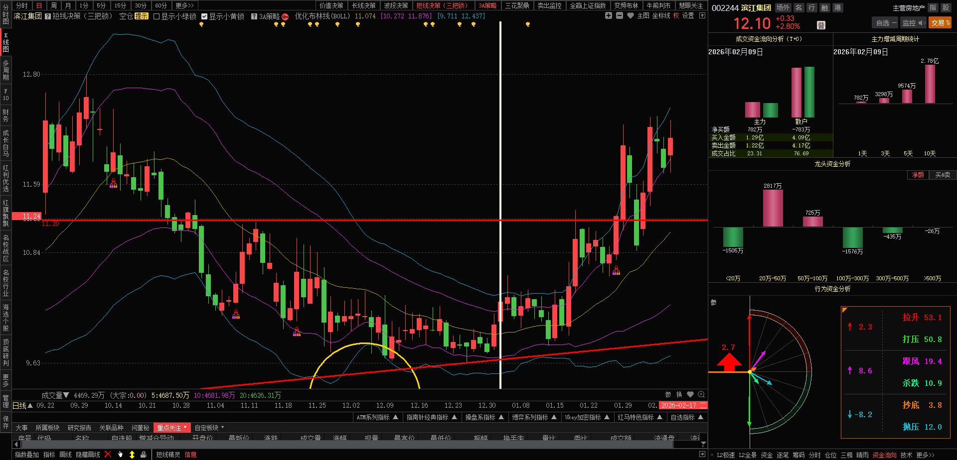 今日滨江主力随大盘做多,换手率1.66%, 涨幅2.80%,收盘价12.10元,今日多空资金净流入1971.32万元,上升趋势完好。继续锁仓做T,摊低持仓成本,保持好心态。短线支撑位12.02元,阻力位12.55元。
