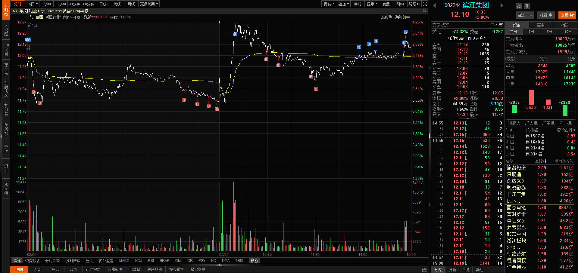 今日滨江主力随大盘做多,换手率1.66%,涨幅2.80%,收盘价12.10元,今