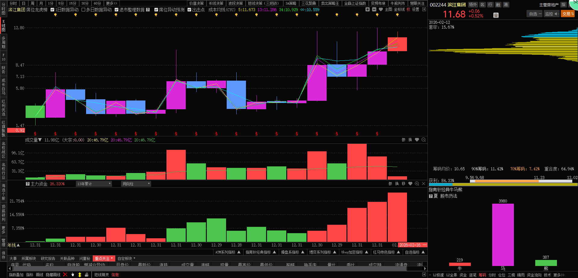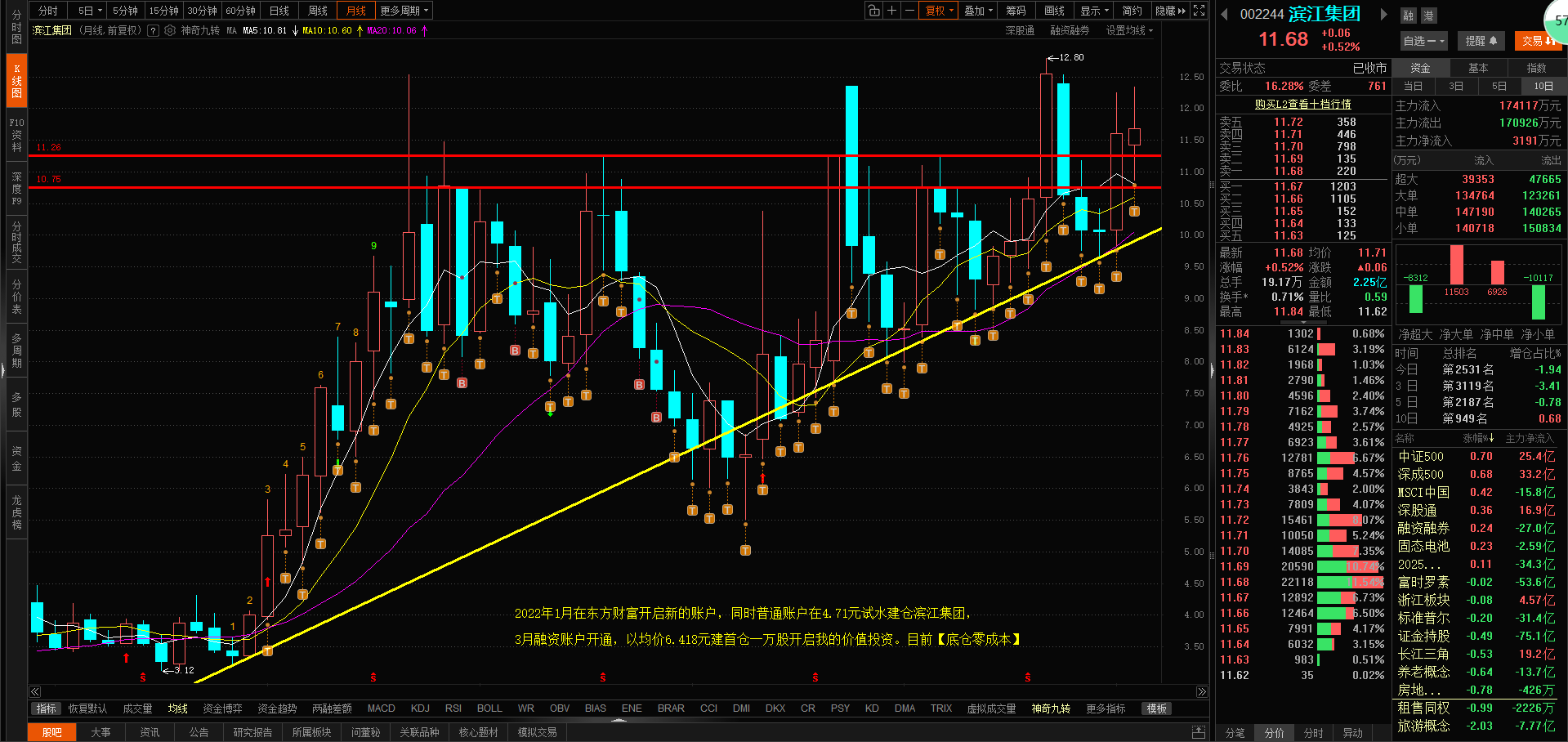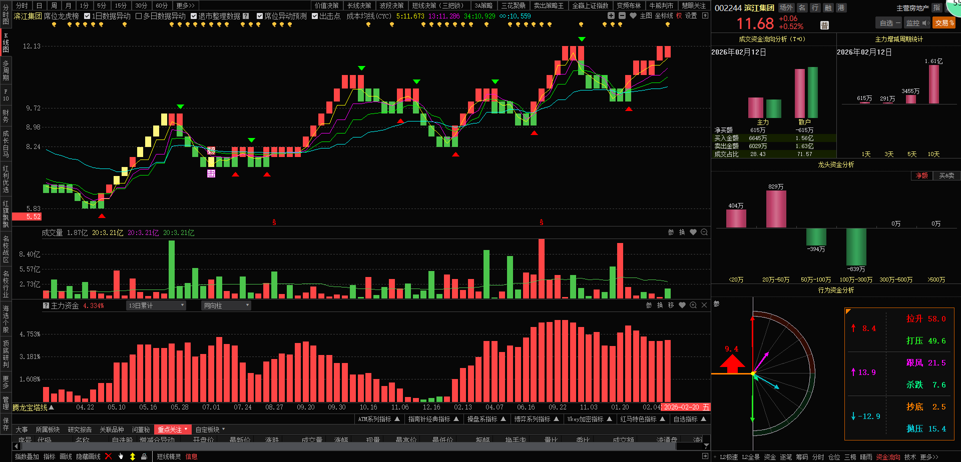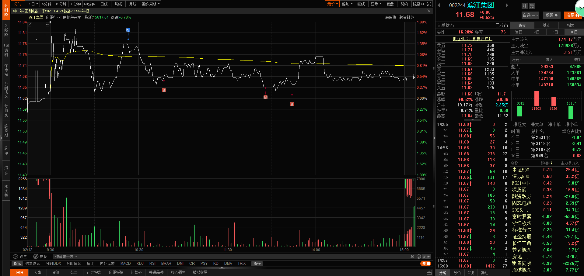 今日滨江缩量整理,换手率0.71%,涨幅0.52%,收盘价11.68元,今日多空