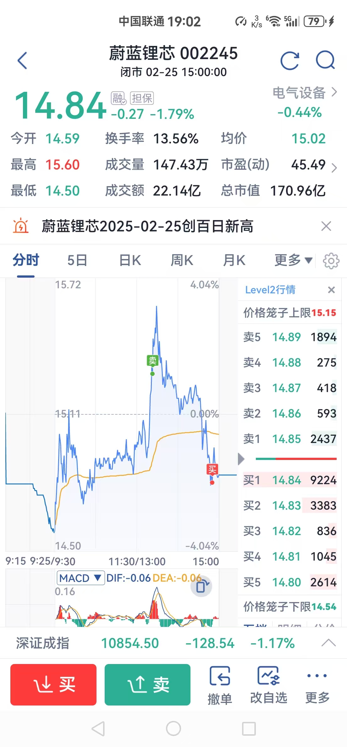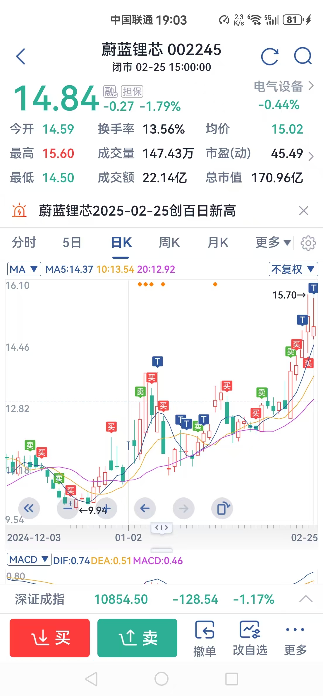 这股涨跌有那么重要吗?本来就是量化股,底仓拿好即使下跌也是可以赚钱的,昨天15.03加仓,今天继续一个T,几乎又买回在收盘前的最低点,股价下跌基本与我无关,只是上班无法盯盘高点没走好。明天若下跌继续做个反T。