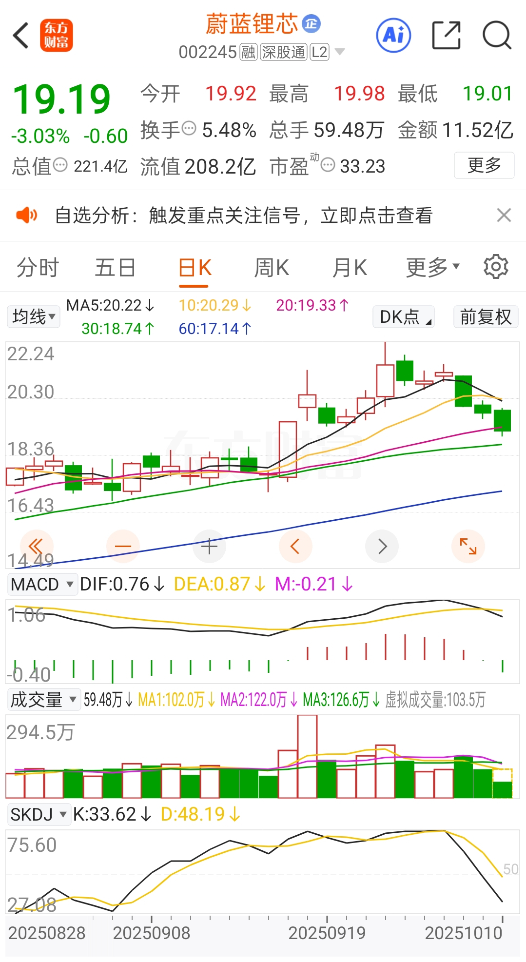 $蔚蓝锂芯(SZ002245)$ 三连阴,空方炮,后面走势岌岌可危!