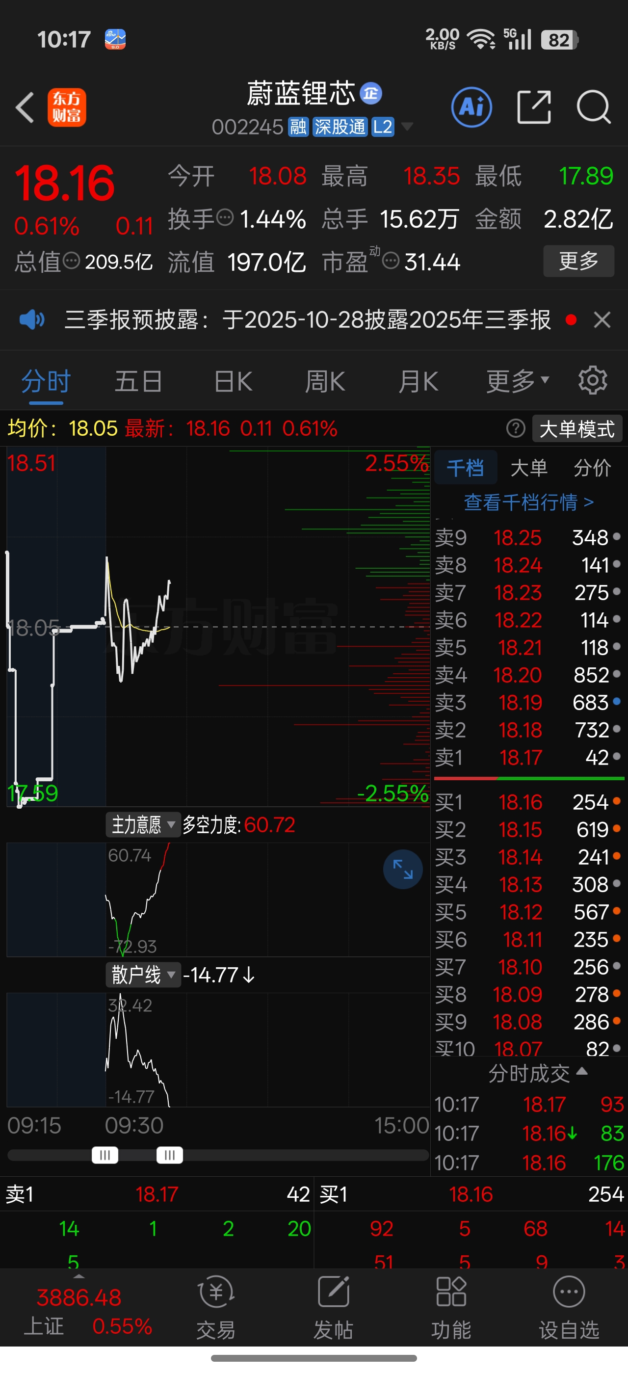 $蔚蓝锂芯(SZ002245)$ 已经开始升了, 但是散线还在跑。跑的差不多了,应该就会开拉。