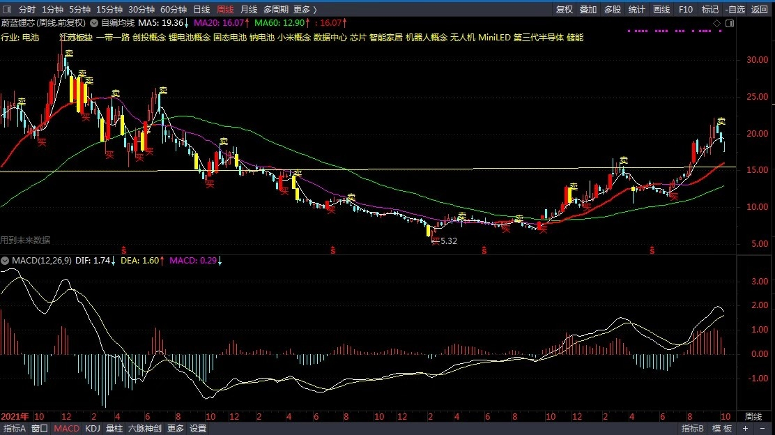 今天25/10/17星期五,蔚蓝继续调整,周线MACD即将死叉,先看前高位置15