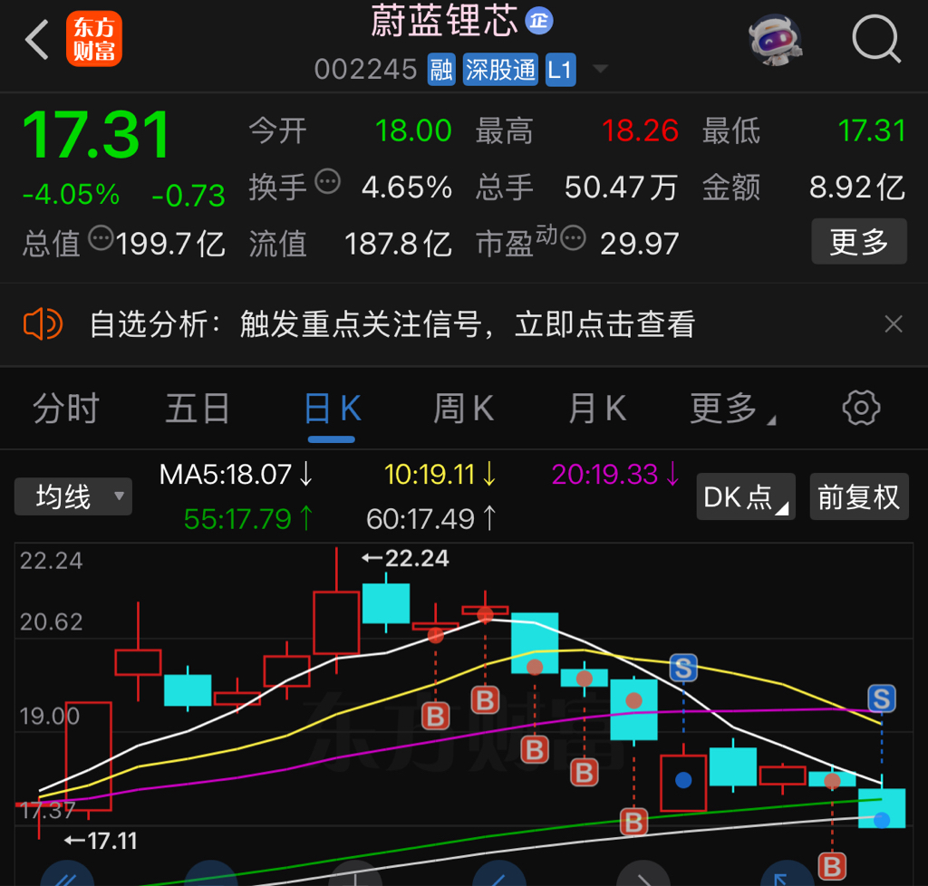 $蔚蓝锂芯(SZ002245)$ 买入后就一直跌,再没上去过,先于电池板块下跌,买入到今天跌了16多个点