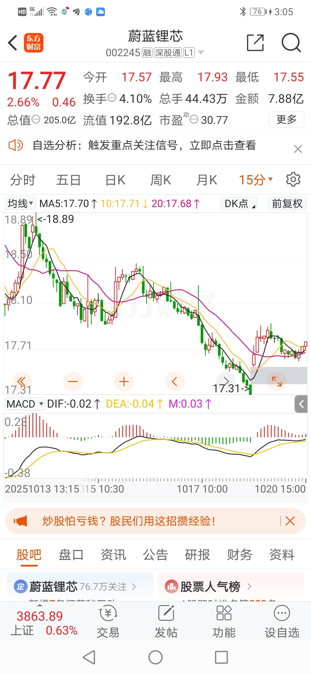 $蔚蓝锂芯(SZ002245)$ 跳空高开二毛六主力想干嘛呢