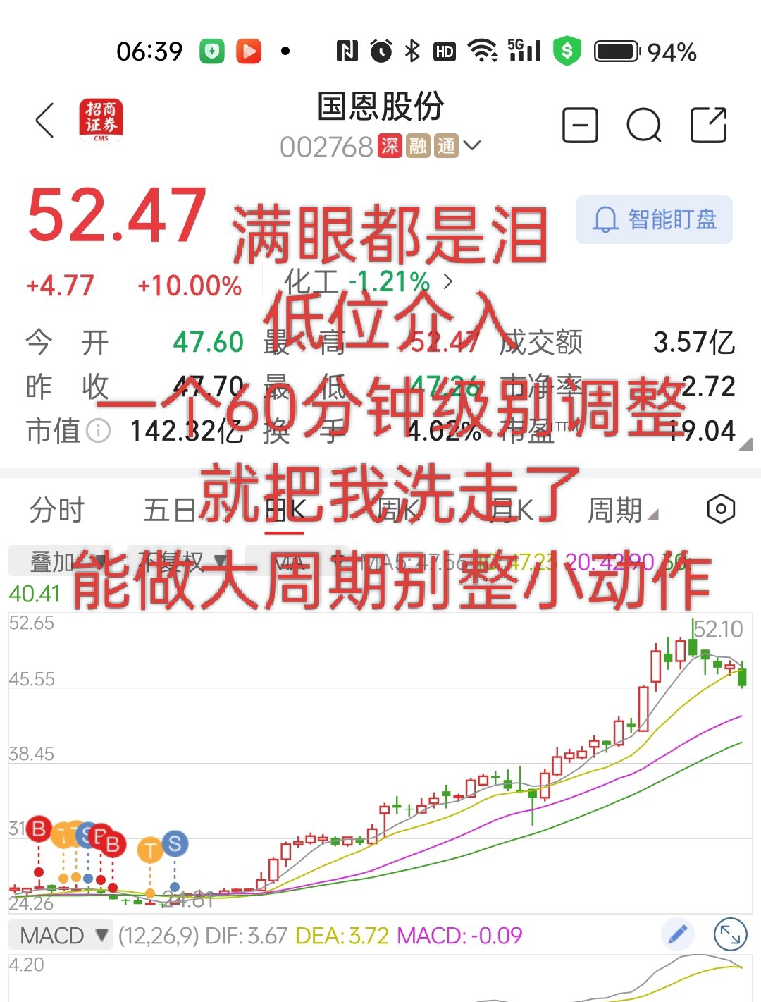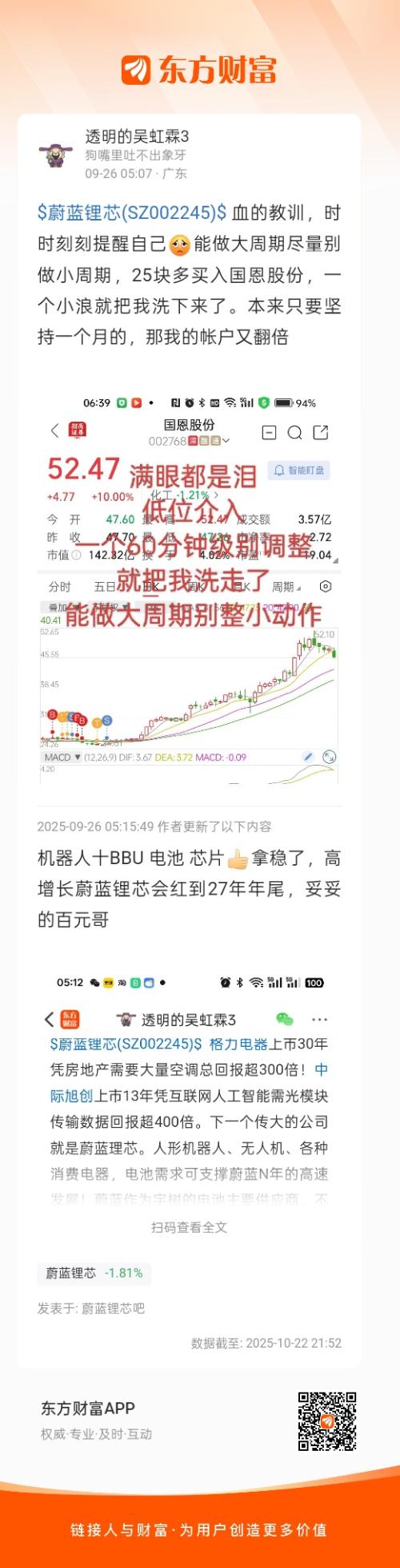 $蔚蓝锂芯(SZ002245)$ 血的教训,时时刻刻提醒自己能做大周期尽量别做小周期,25块多买入国恩股份,一个小浪就把我洗下来了。本来只要坚持一个月的,那我的帐户又翻倍