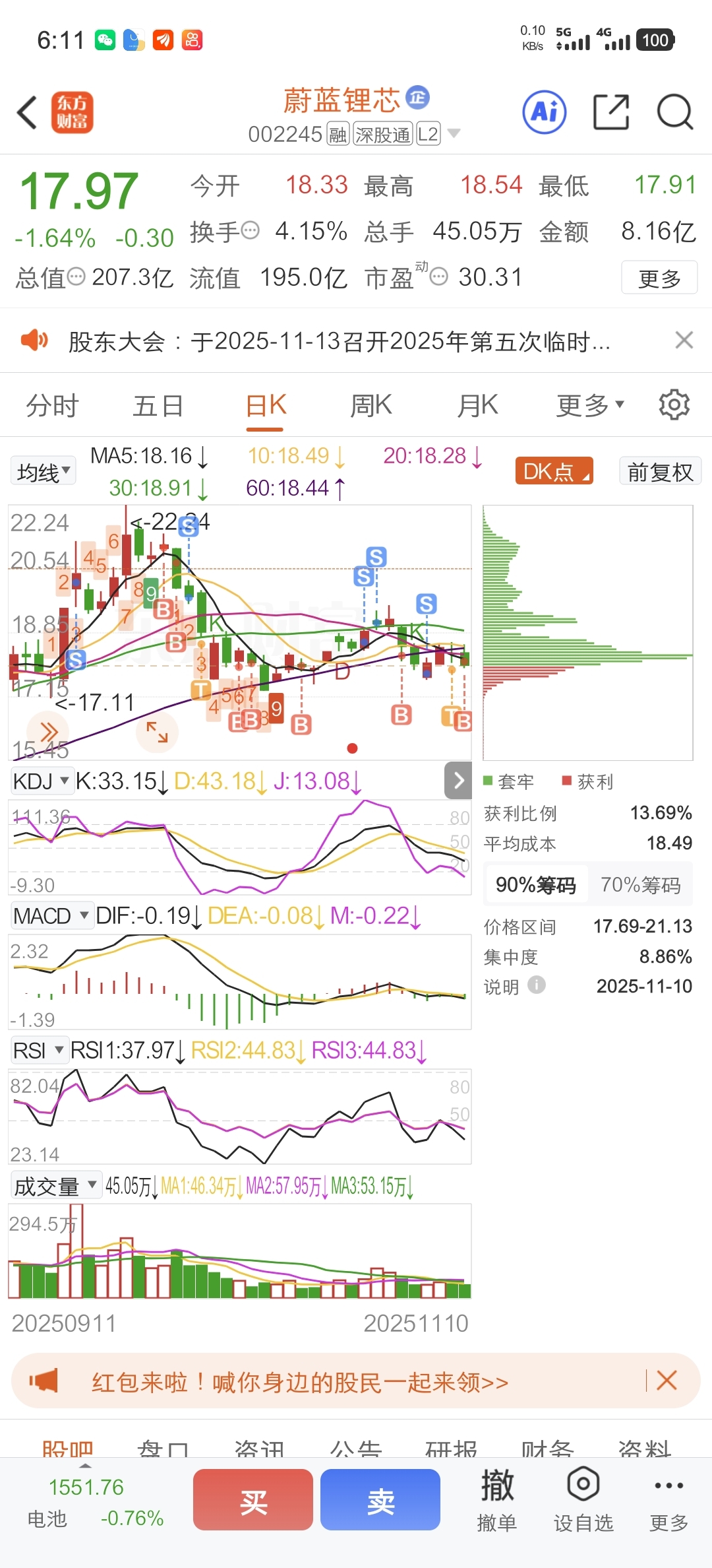 $蔚蓝锂芯(SZ002245)$ 最近科技修复,这周加速,反正亏的懒得卖了,好好拿着,今天中间补了点补早了,明天反弹就出今天买的