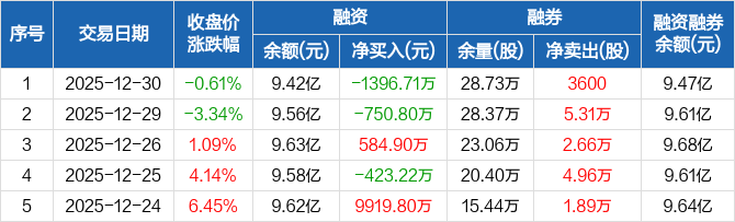 融资方面,当日融资买入8685.83万元,融资偿还1.01亿元,融资净偿还1396.71万元。融券方面,融券卖出1.14万股,融券偿还7800股,融券余量28.73万股,融券余额512.83万元。融资融券余额合计9.47亿元。
