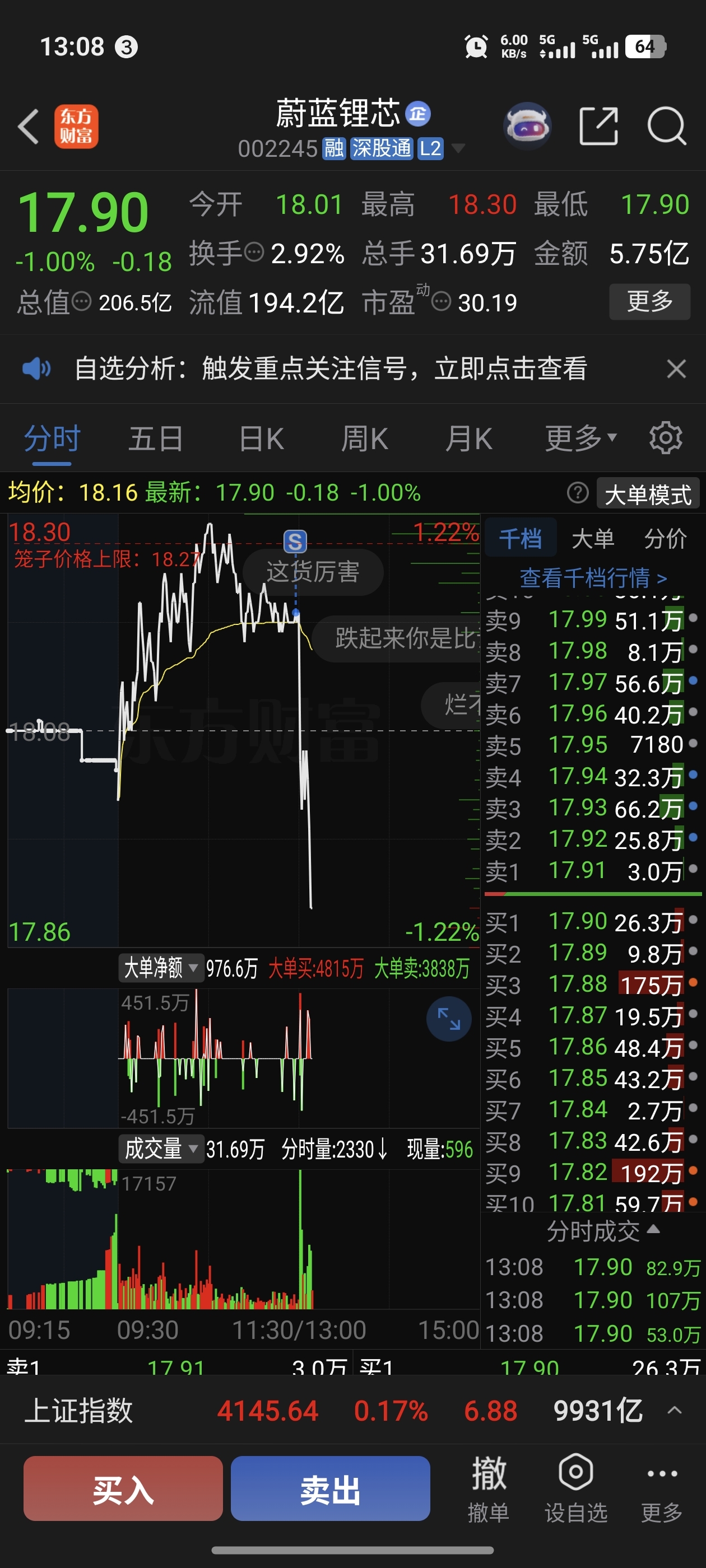 $蔚蓝锂芯(SZ002245)$ 先走了怕怕