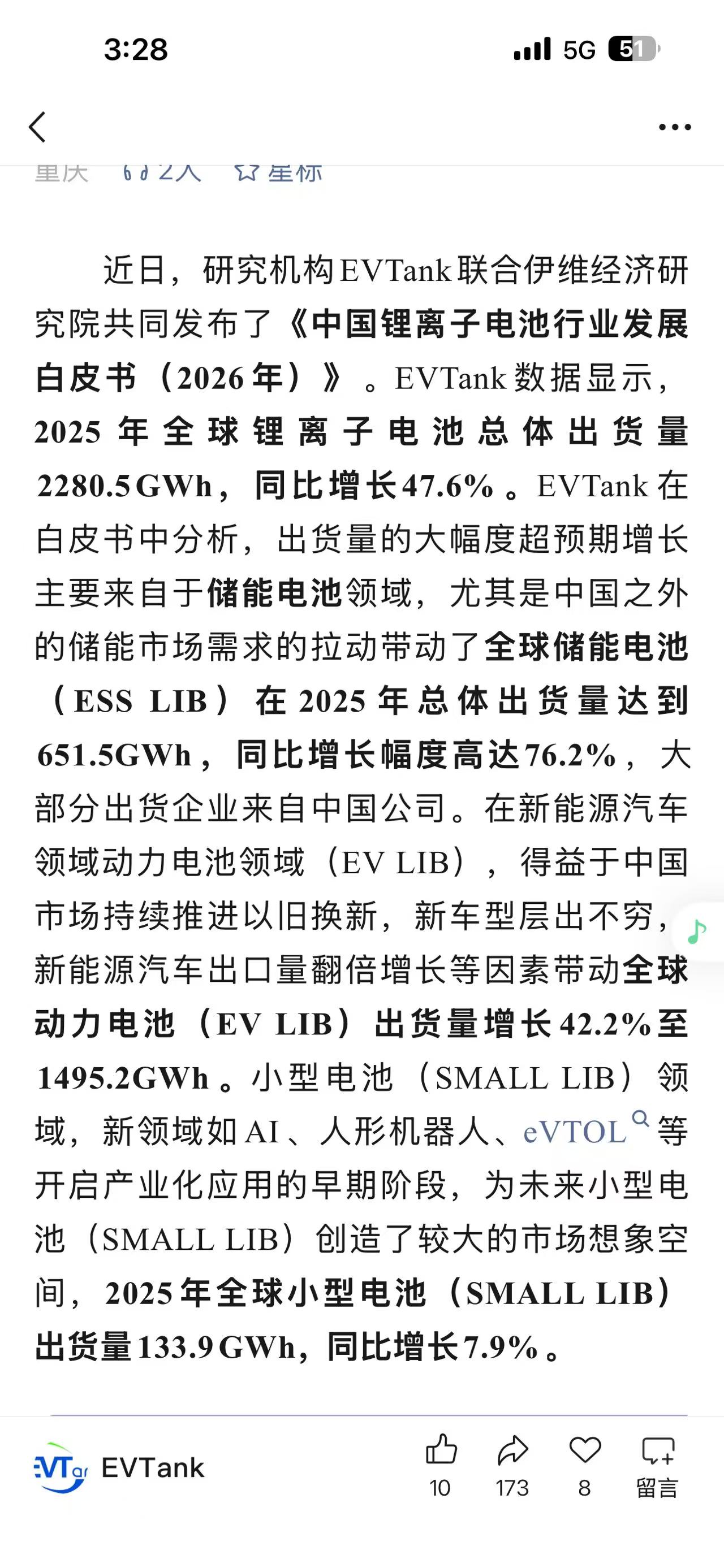 研究机构EVTank发布数据,小型电池出货量2025年同比增长7.9%
