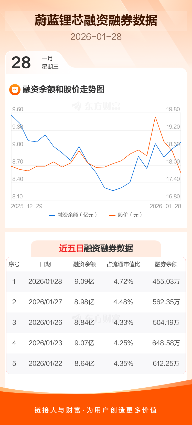 交易所最新数据显示,蔚蓝锂芯于2026年1月28日获融资买入1.01亿元,融资偿还8994.49万元,当日融资净买入1078万元。目前,该股融资余额9.09亿,占流通市值比例为4.72%。