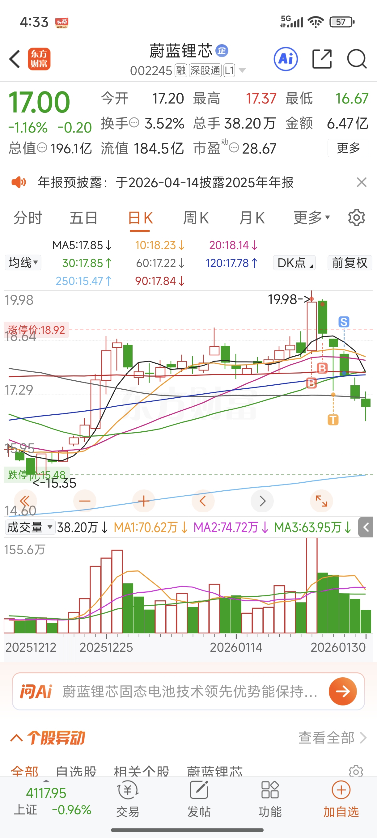 $蔚蓝锂芯(SZ002245)$ 一年以来单周最大跌幅,进来三天亏了9个点割肉走了,把在影响我一月利润缩水了一半!!