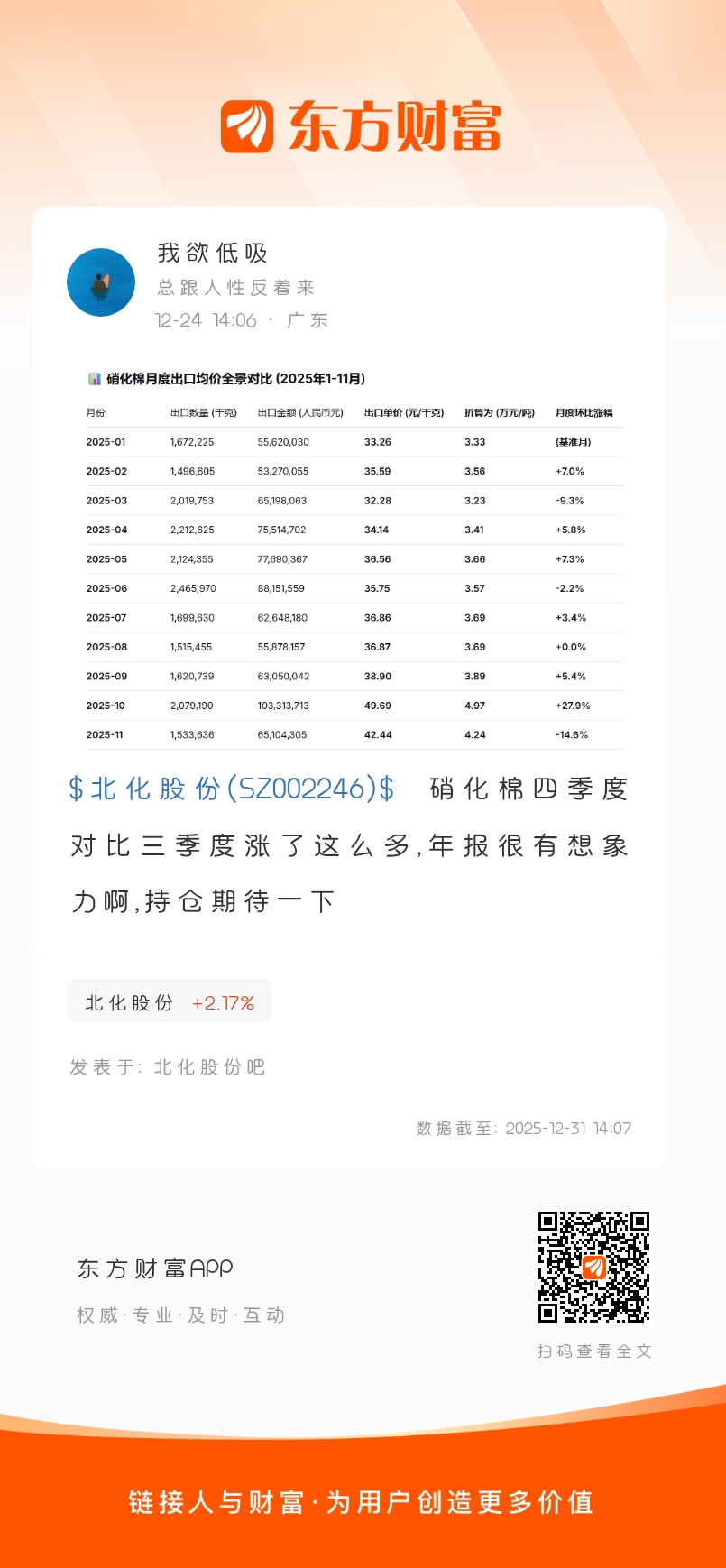 $北化股份(SZ002246)$  硝化棉四季度对比三季度涨了这么多,年报很有想象力啊,持仓期待一下