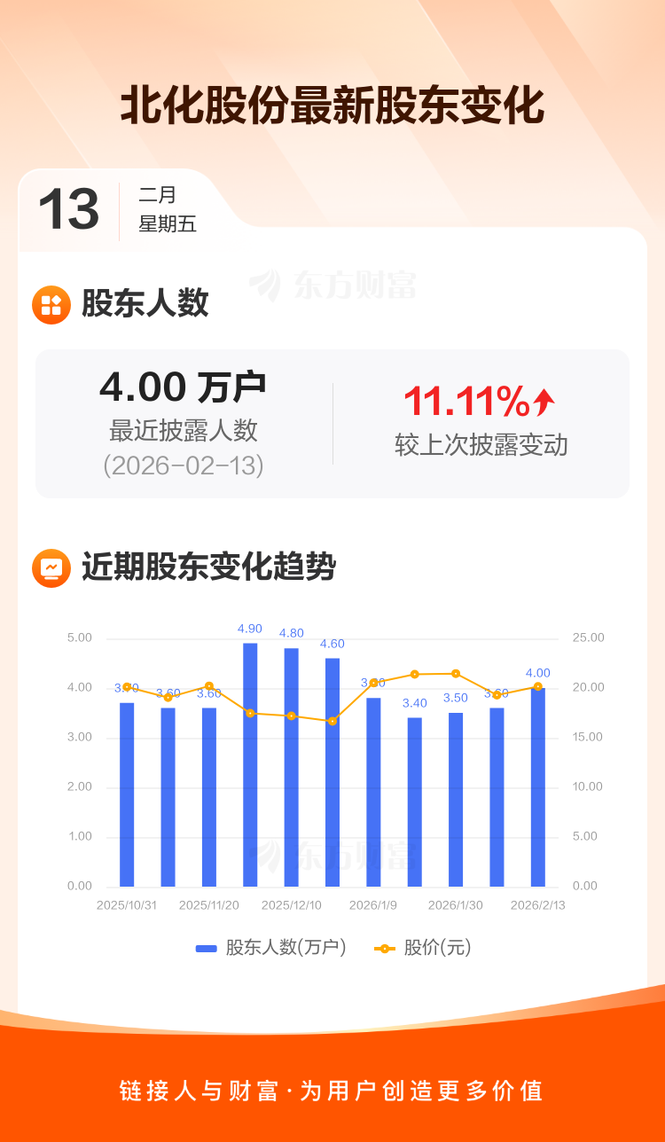 北化股份最新披露数据显示,截至2月13日公司股东户数为4.00万户,较上期(2026年2月10日)增加4000户,增幅为11.11%。户均持有流通股数量由上期的1.53万股下降至1.37万股,户均持股金额由上期的29.42万元减少至27.66万元。