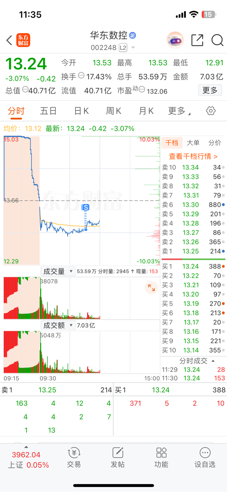 $华东数控(SZ002248)$ 13块卖了。拉起来真要吐血啊。打板亏两万