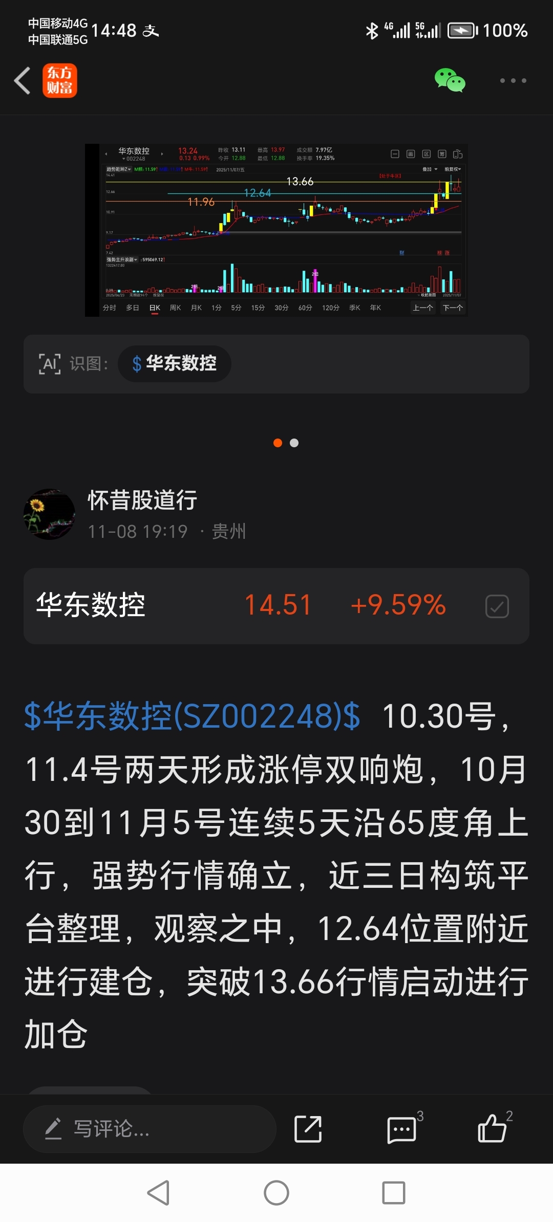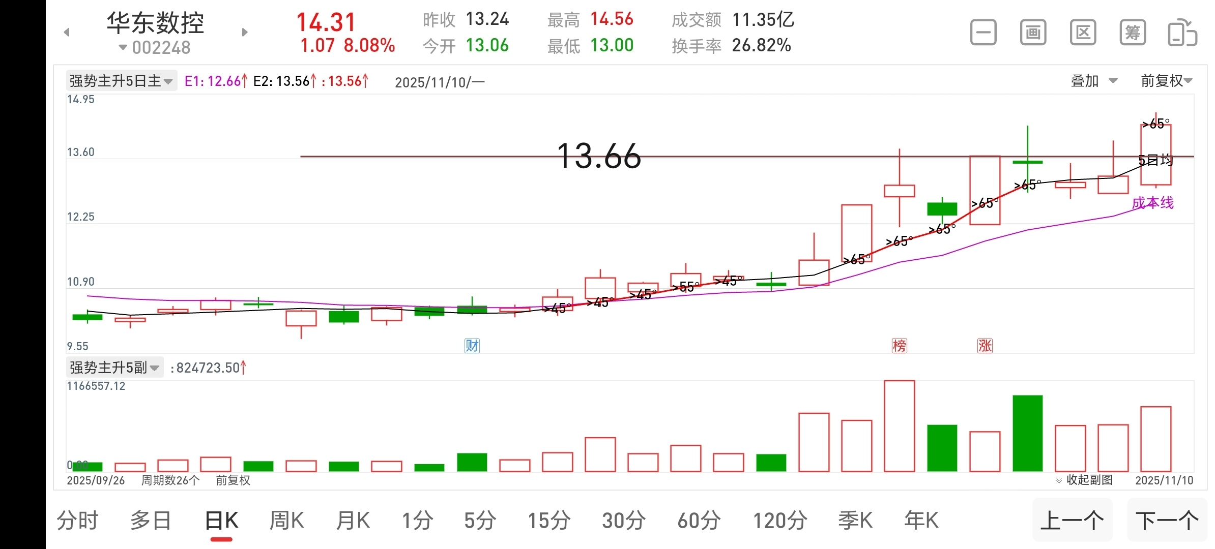 $华东数控(SZ002248)$ 今天突破13.66确认后跟进,前贴有提示,并且打出65度角弱转强,强势启动,后期走势不破5日线不走人