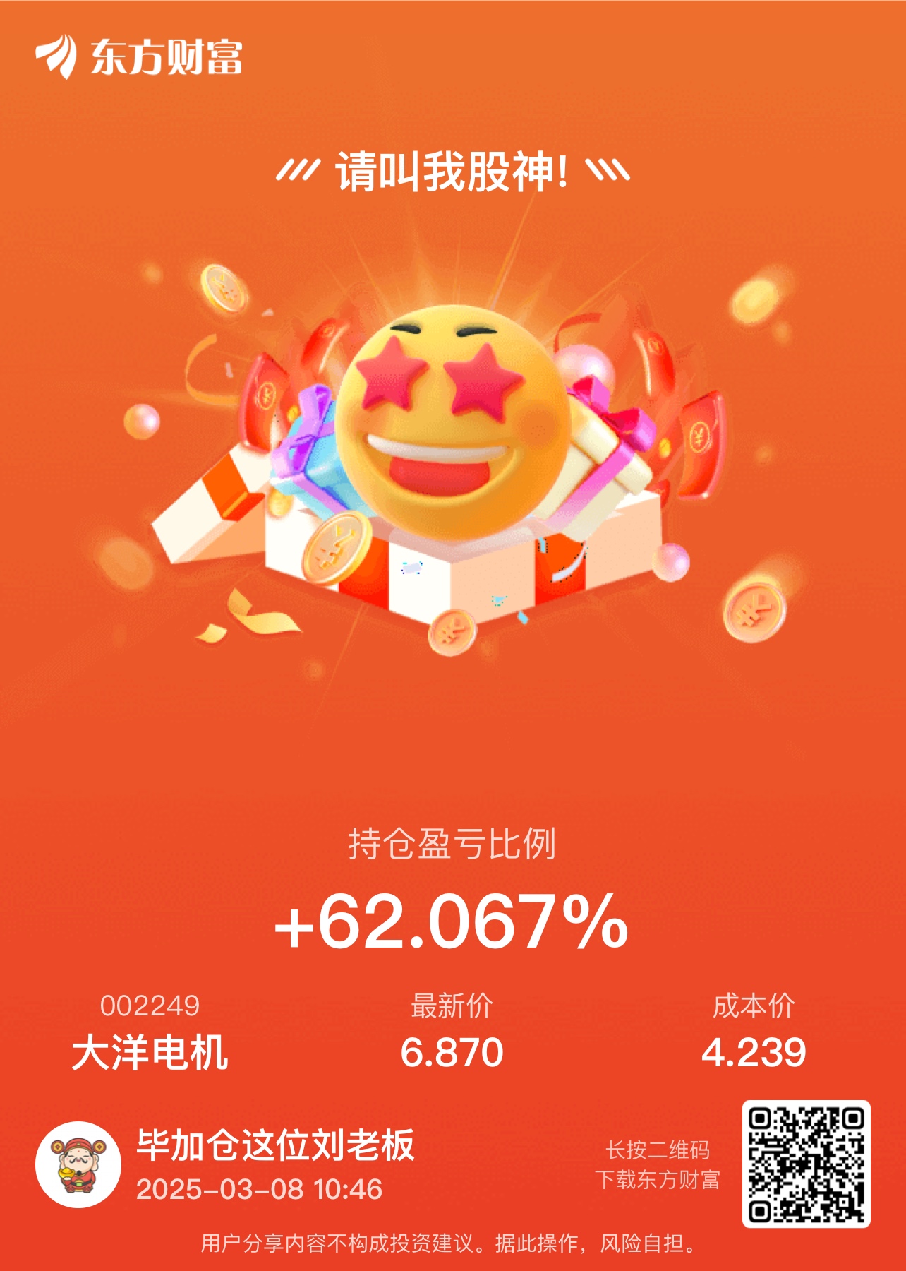 温馨提示: 1.根据《证券法》规定,禁止编造、传播虚假信息或者误导性信息,扰乱证券市场;2.用户在本社区发表的所有资料、言论等仅代表个人观点,与本网站立场无关,不对您构成任何投资建议。用户应基于自己的独立判断,自行决定证券投资并承担相应风险。《东方财富社区管理规定》
