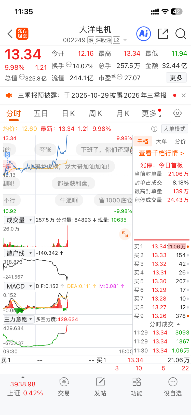 $大洋电机(SZ002249)$ 密码的早上大额流出,c