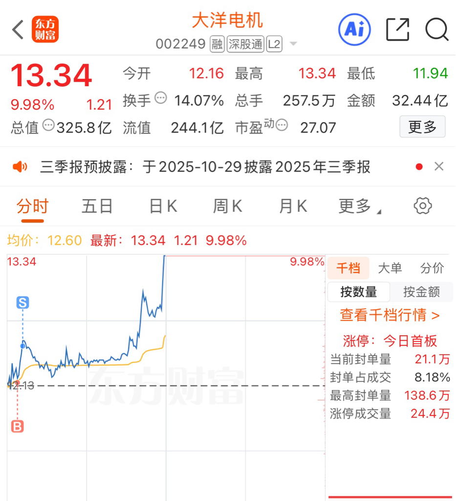 $大洋电机(SZ002249)$ 早上t完本来想着下来一点要接着买入的,结果工作忙起来没顾上,这么快就涨停了
