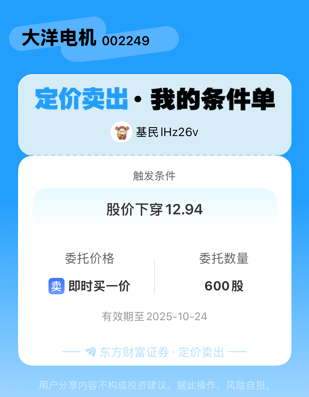#条件单交流# #定价卖出晒单# 一位股神设置了一个定价卖出条件单,接下来就是见证奇迹的时刻~$大洋电机(SZ002249)$