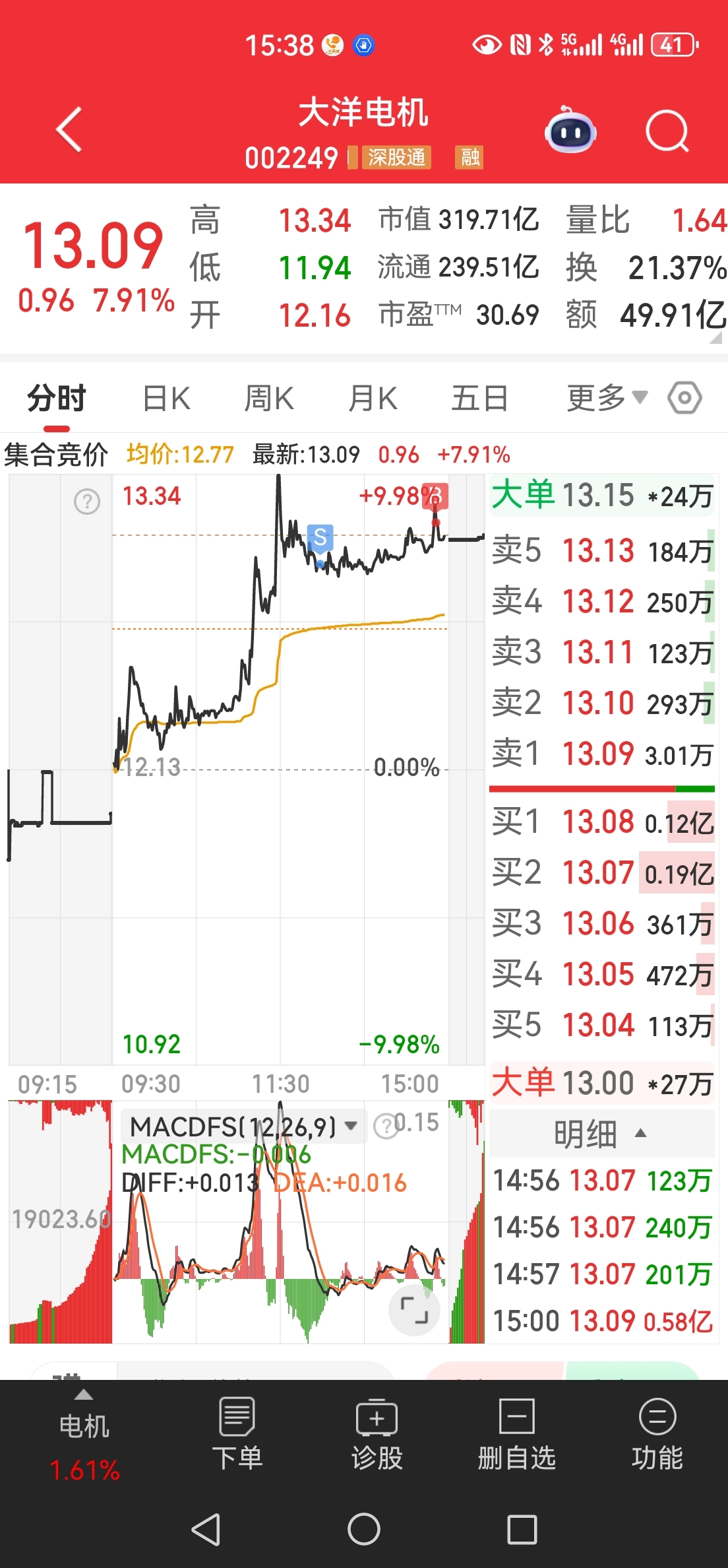 $大洋电机(SZ002249)$ 同花顺每次发都不给发,我说下今天的看法今天涨停挂卖没有挂出去然后12.97挂出去的!然后想大洋还是老样子,尾盘打开看了一下今天有点猛才想到下周财报要公示!然后13.14买进!如果财报利好下周一就一字或者高开高走!如果财报不好估计就拉高出货了!一点愚见不要喷欢迎指导