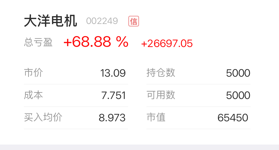 $大洋电机(SZ002249)$ 可惜呀,只有5000股,不然就能发财了