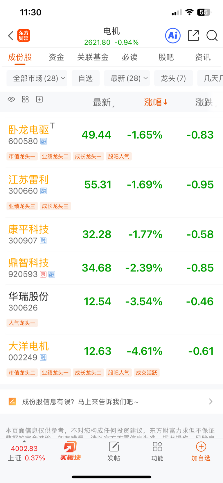 $大洋电机(SZ002249)$ 大洋的机会很多,今天多重因素叠加导致今天大幅回调,属正常,涨势依旧。1、上周涨幅太大。2、业绩稍低于预期。3、主力借机洗盘。4、获利盘兑现。电机板块显示如下,请看图:
