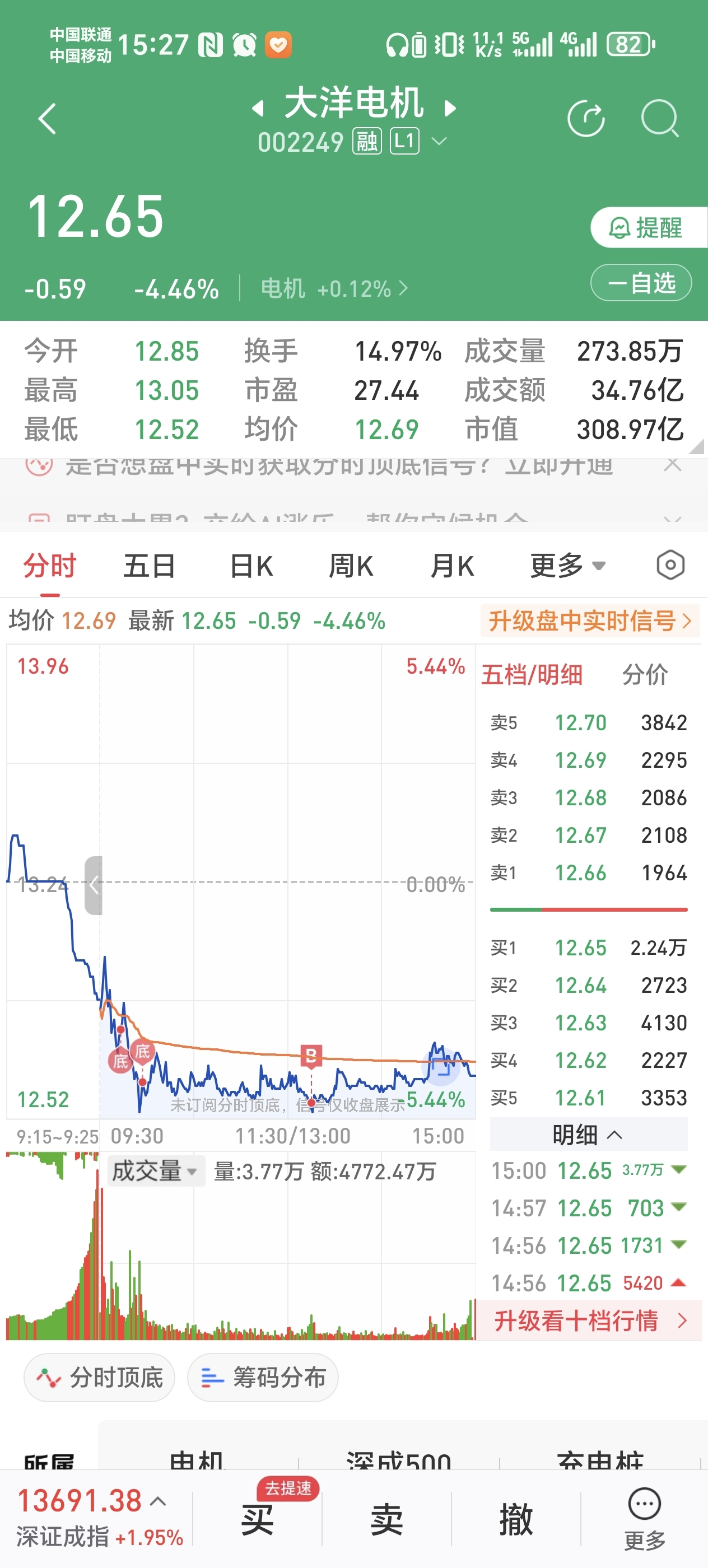 $大洋电机(SZ002249)$ 昨天挂12.8没吸到,今天12.55吃到了,净赚两毛五