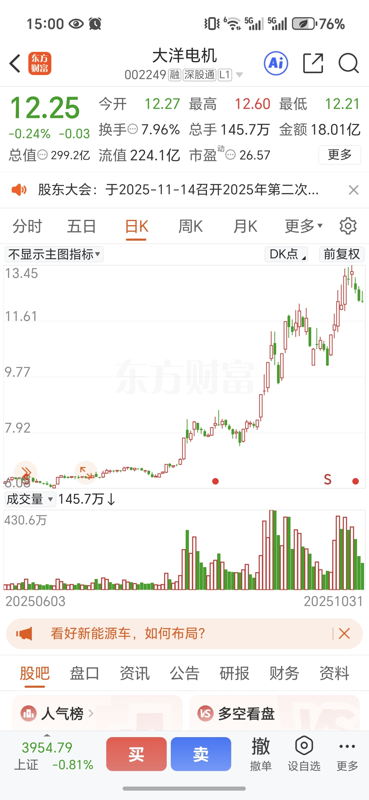 $大洋电机(SZ002249)$ 散户太多,温水煮青蛙阴跌,今天刚买,周一不涨割了,