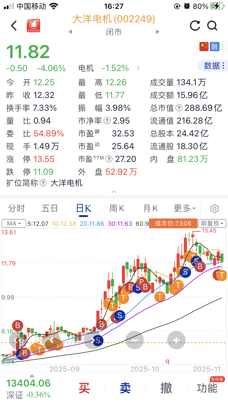 $大洋电机(SZ002249)$ 跌下来了就是机会,今天仓位加满,看好这个月突破15.
