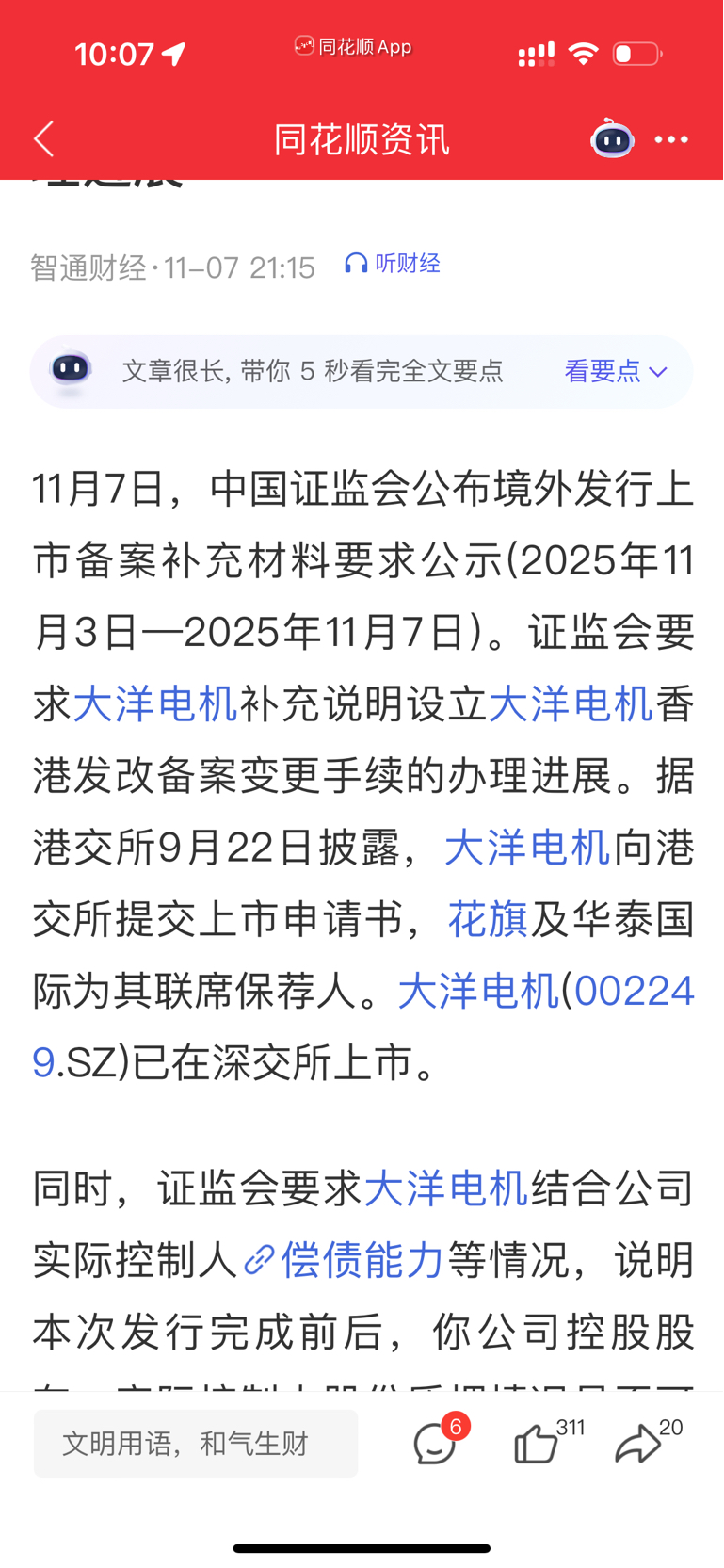$大洋电机(SZ002249)$ 证监会要求大洋电机就香港发行股票说明情况