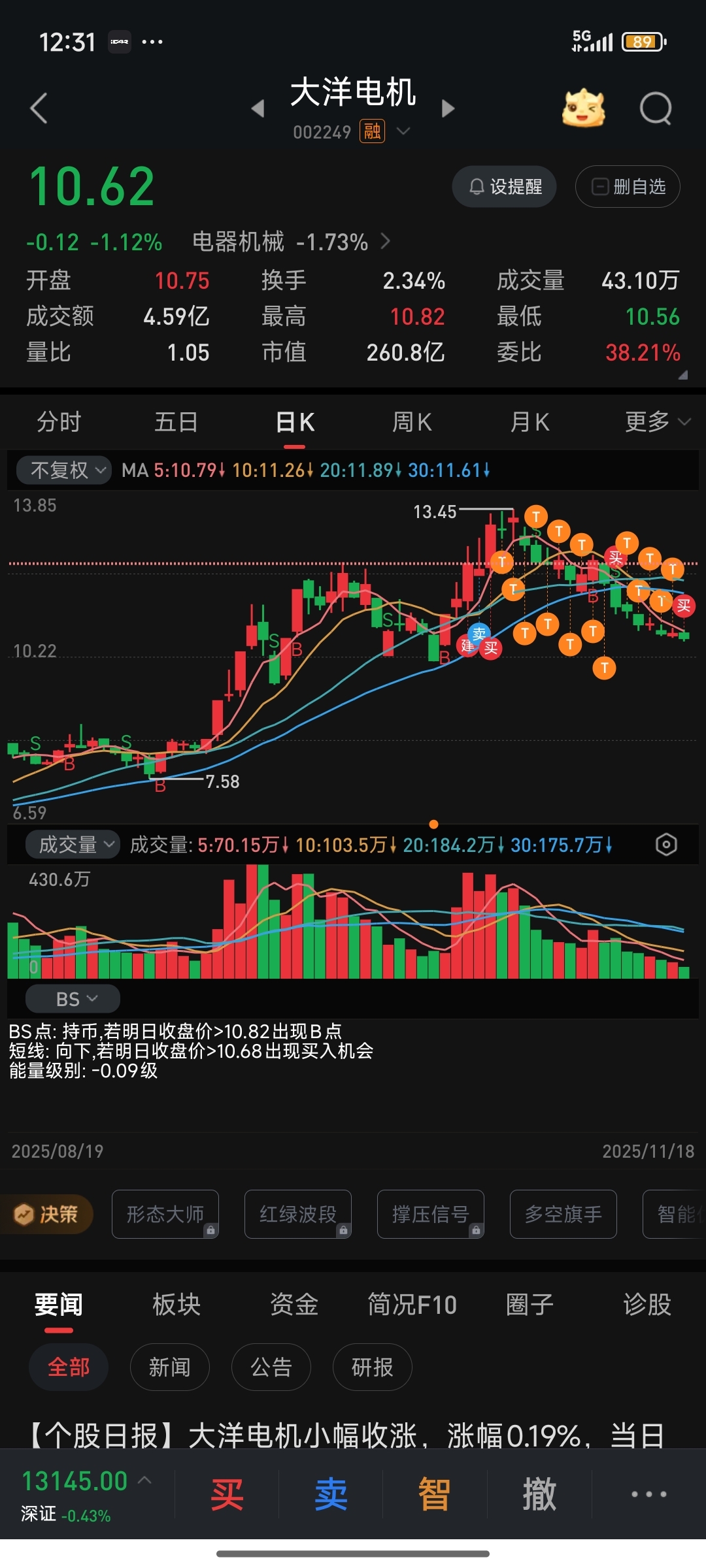 $大洋电机(SZ002249)$ 做T都做不动了,亏13个点,太累了!