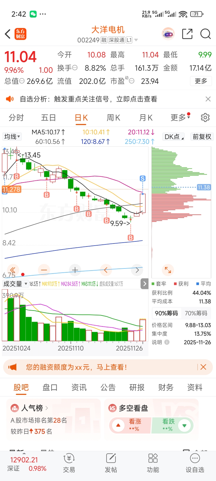 $大洋电机(SZ002249)$ 我反正跑了两个红点。