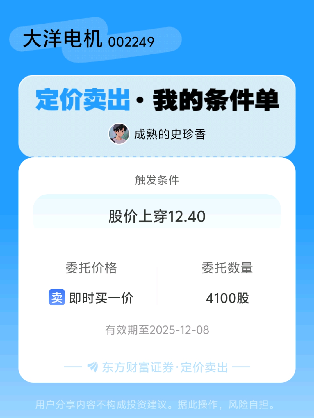 #条件单交流# #定价卖出晒单# 一位股神设置了一个定价卖出条件单,接下来就是见证奇迹的时刻~$大洋电机(SZ002249)$